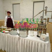 Реализация: полевая кухня в одном из множества вариантов (от котлов в офисе до прицепа-кухни, дымящей на парковке) со множеством дополнительных «наполнителей» (бутерброды с салом, соленья, чай, компот и т.п.). И – непременно! – не забудьте о фронтовых 50 гр.: прекрасно и фактурно с этой ролью справляется самогонная станция…