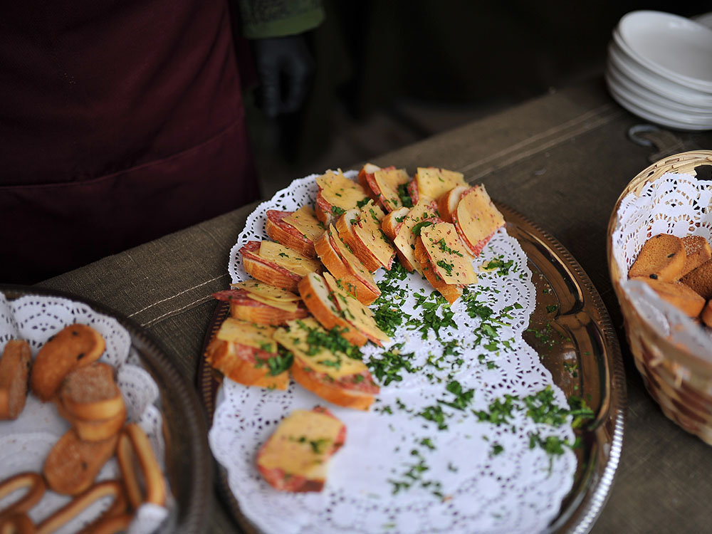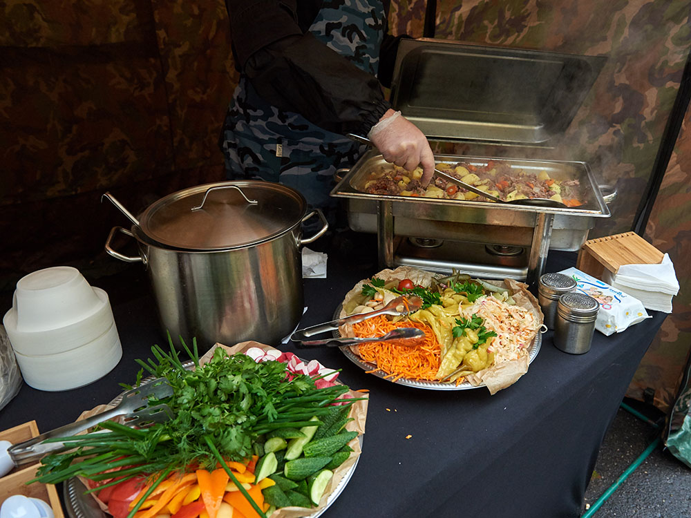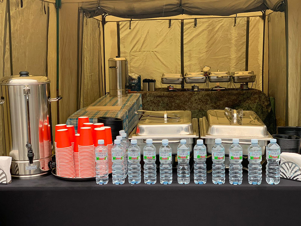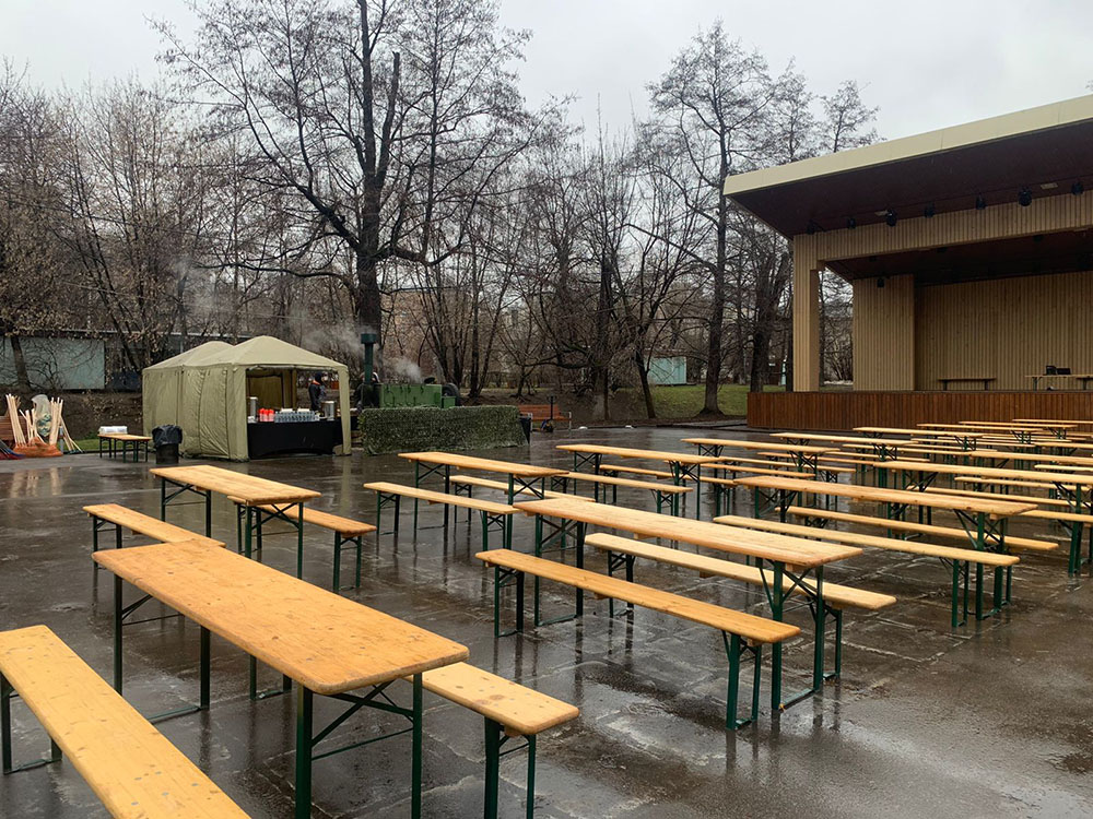 На площадку доставили настоящую полевую кухню: с её помощью всех накормили горячим и вкусным обедом прямо на месте. Для перекуса и короткого отдыха обустроили уютную зону с удобными столами и стульями. А чтобы участники могли укрыться от солнца или внезапного дождика, установили просторные шатры и палатки.