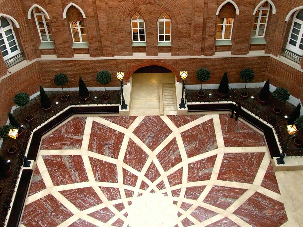 Атриум Хлебного дома, являющийся результатом комплексной реконструкции исторического здания XVIII века, представляет собой обширное и хорошо освещенное пространство с изысканным мозаичным мраморным покрытием пола, великолепной акустической средой и высоким стеклянным куполом, выполняющим функцию крыши. Архитектурное решение данного объекта сочетает в себе элементы исторической аутентичности и современные функциональные особенности, что позволяет ему гармонично интегрироваться в архитектурно-исторический контекст Москвы.