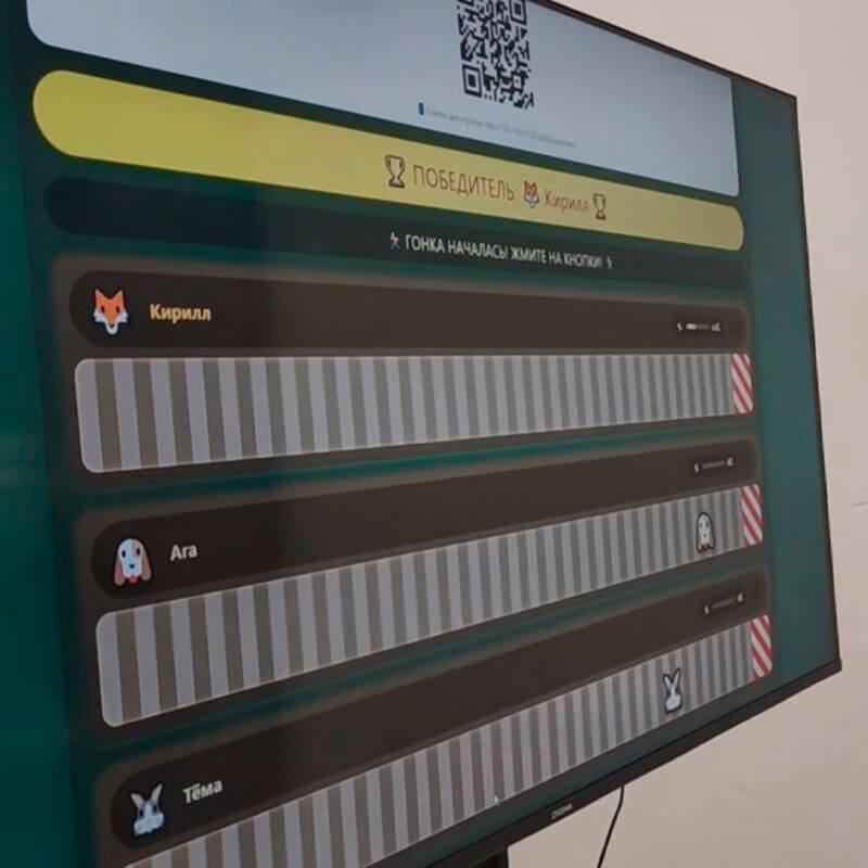 Аттракцион «Тапалка» — это динамичное интерактивное развлечение, которое идеально подходит для корпоративных мероприятий любого формата. Участники подключаются к системе через QR-код, переходят по ссылке на своих смартфонах и вводят имя и выбирают персонажа. После того как все готовы, оператор запускает игру, и начинается захватывающая гонка на скорость реакции.