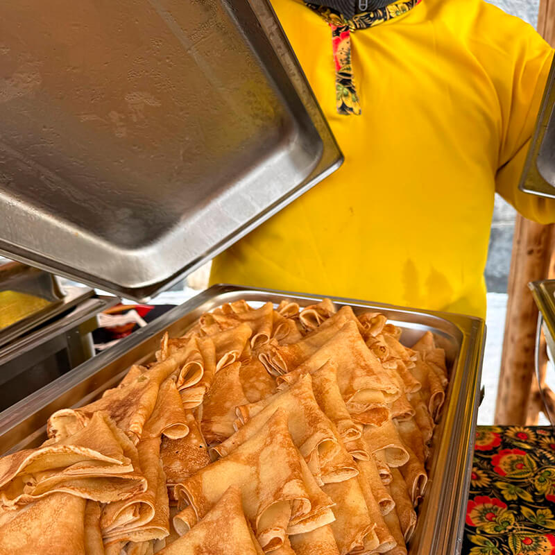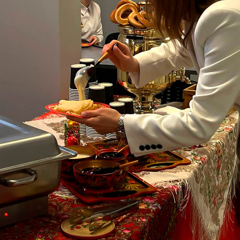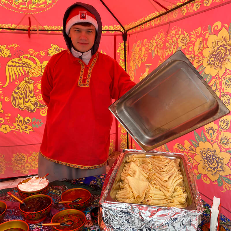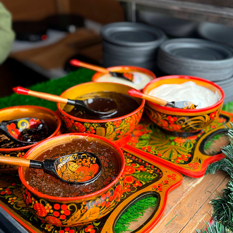 Погрузитесь в атмосферу настоящего народного праздника с нашей блинной станцией! Мы привезём всё необходимое оборудование и приготовим свежие, пышные блинчики прямо на глазах у гостей — это не просто угощение, а целое кулинарное шоу для ваших масленичных гуляний. Организуем праздничное гулянье: современное оборудование для быстрого и качественного приготовления блинов, опытные повара в праздничной русской одежде, стильная тематическая сервировка в народном стиле, мебель, посуда. Возможно доставка готовых блинов разного размера и начинками.