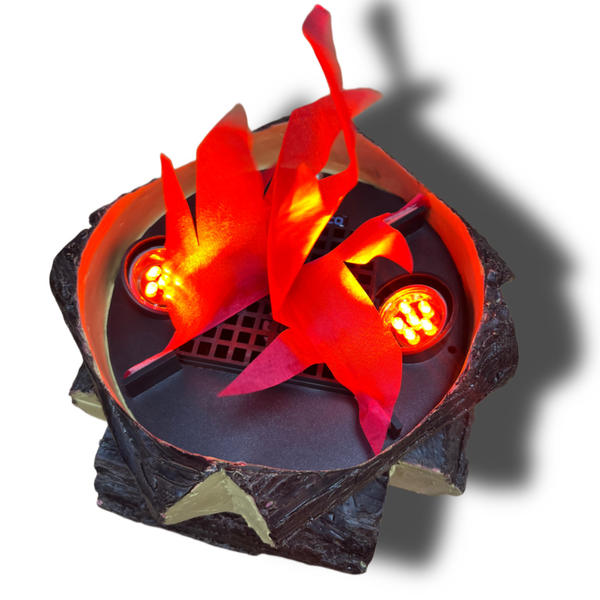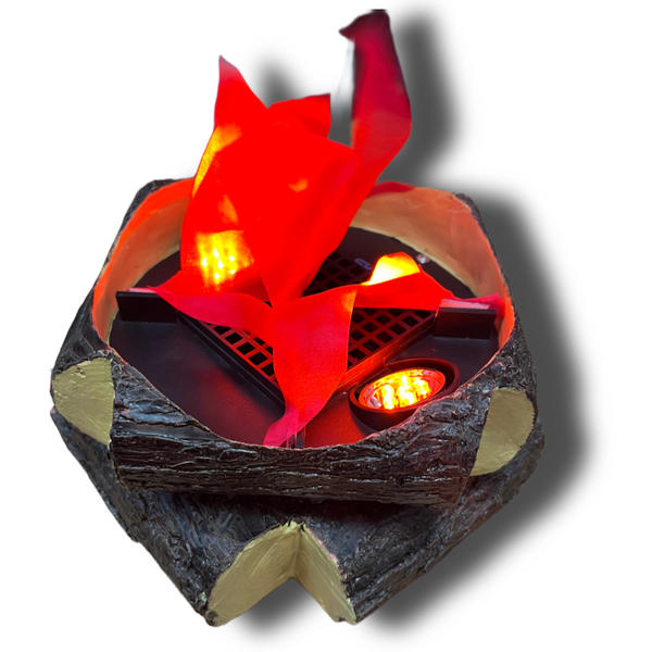 Наш сценический муляж костра — это идеальное решение для создания убедительного эффекта огня без использования пламени. Конструкция представляет собой декоративные поленья, внутри которых скрыты вентилятор и светодиодная подсветка. Восходящие потоки воздуха заставляют динамично двигаться вырезанные из алого шелка "языки пламени", а диодная подсветка придает им реалистичное мерцание. Сочетание движения ткани и игры света создает полную иллюзию настоящего огня, который с расстояния выглядит абсолютно правдоподобно, позволяя режиссерам безопасно воплощать на сцене атмосферу походного уюта.