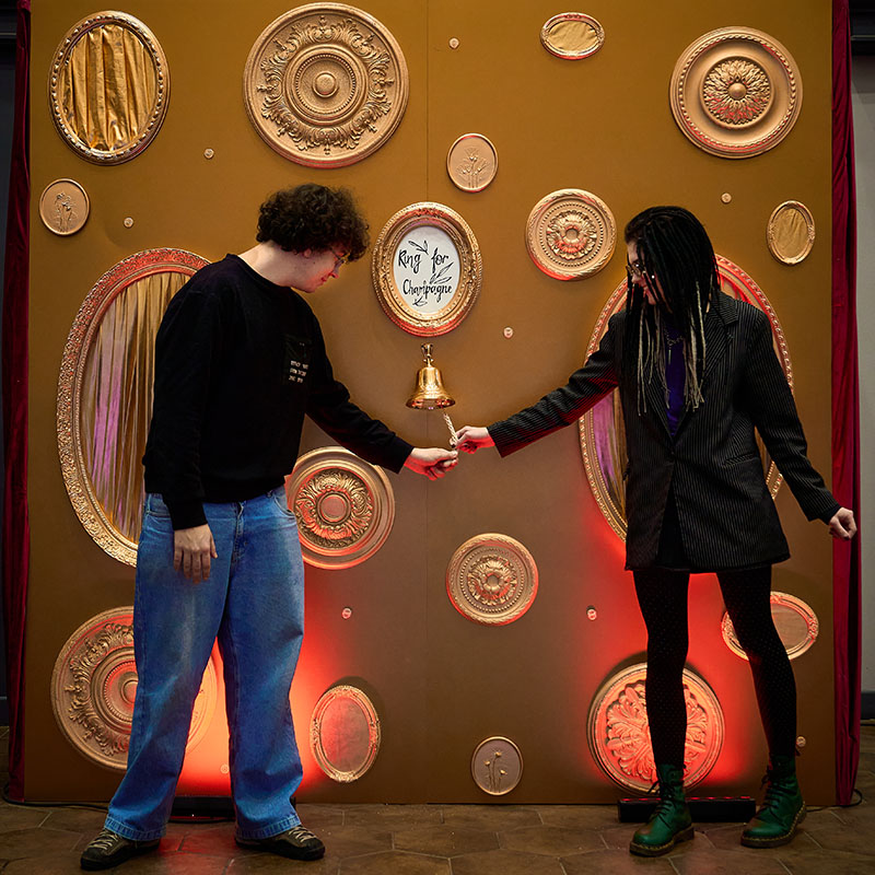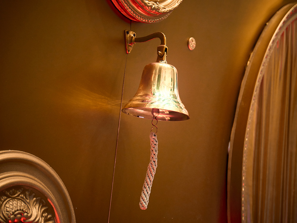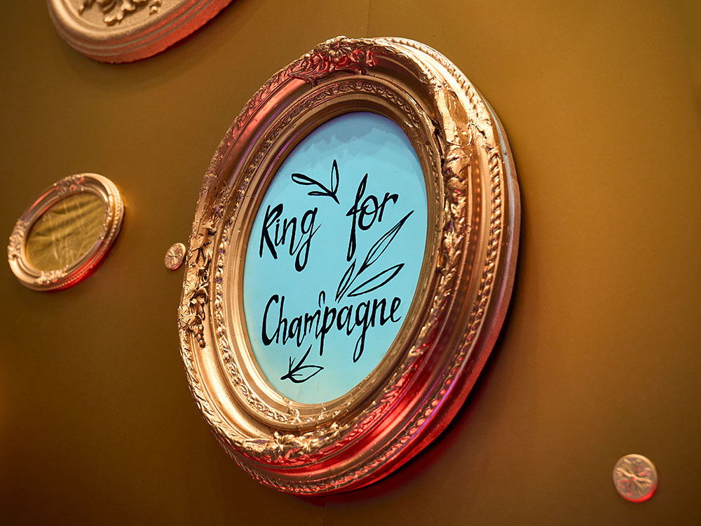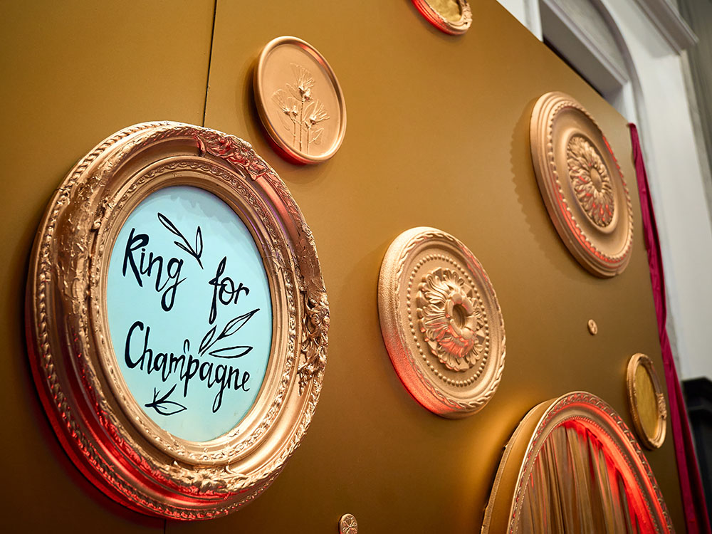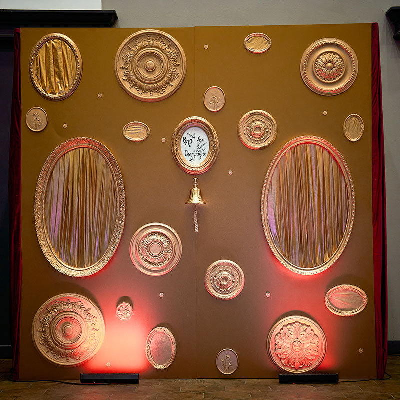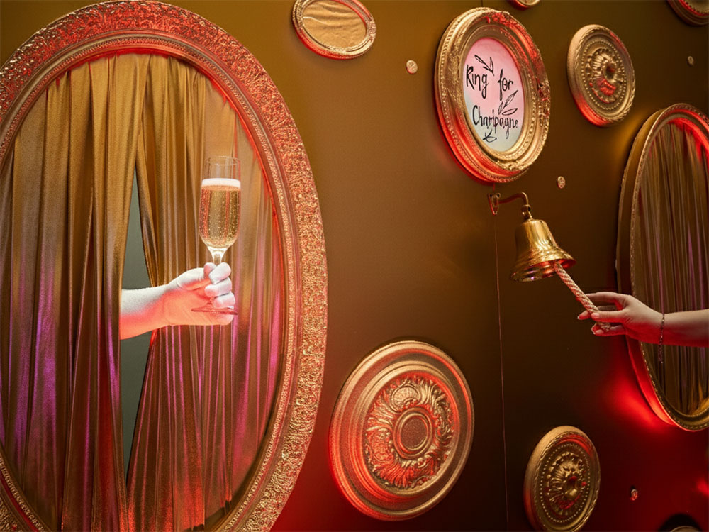 На стене, украшенной элементами в стиле барокко, висит колокольчик. Если позвонить в него, то гостям предложат бокал шампанского: когда раздается звон колокольчика, из стены выдвигаются руки в изящных белых перчатках и преподносят гостю бокал с игристым напитком. Такая фотозона не только украсит любое мероприятие, но и станет удобным способом подачи напитков.