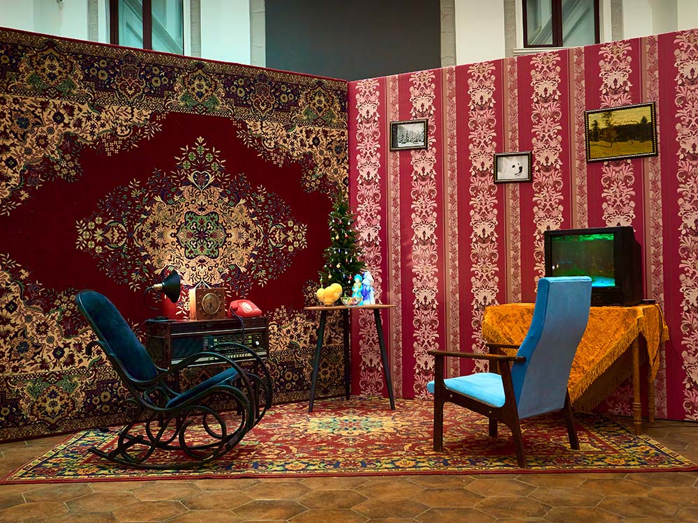 Помимо этого, фотозона наполнена такими ностальгическими предметами советского быта, как телевизор с характерным зеленым свечением экрана, ретро-радиоприемник, дисковый телефон красного цвета и настольные часы в деревянном корпусе. Завершают композицию ковер с восточным орнаментом на полу и фотографии в рамках на стене.