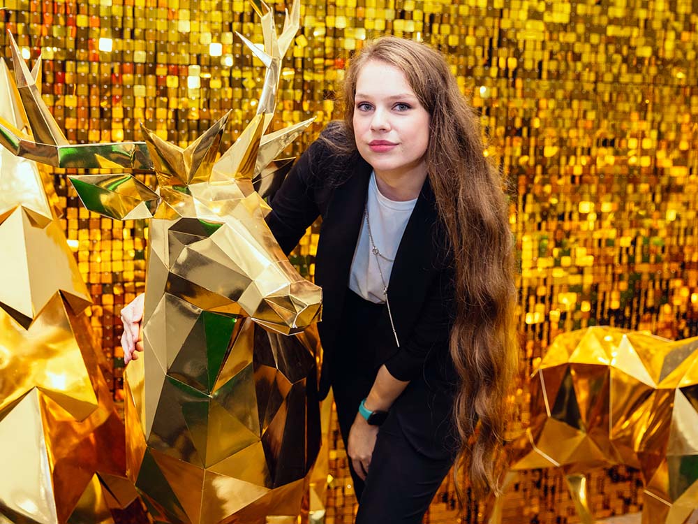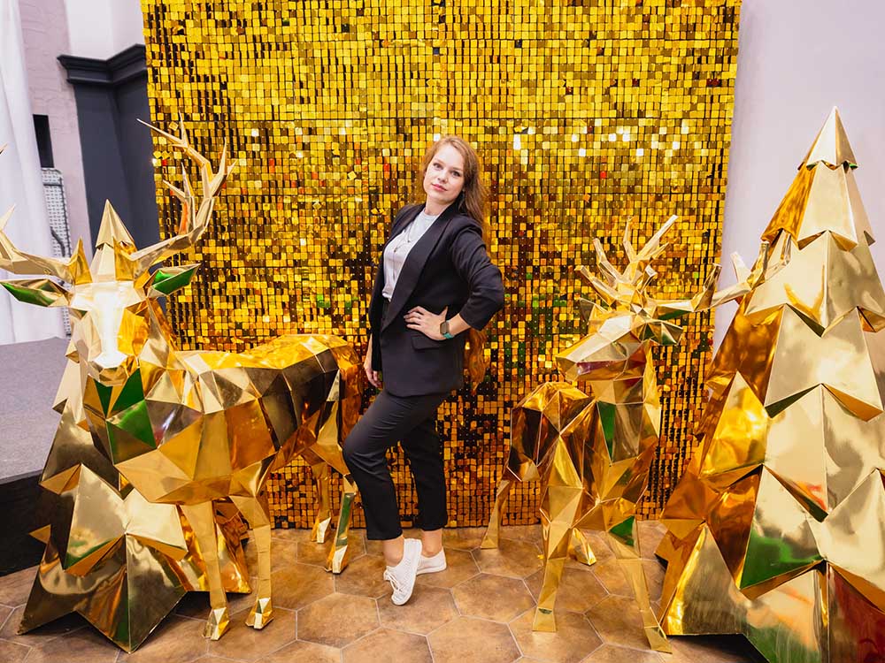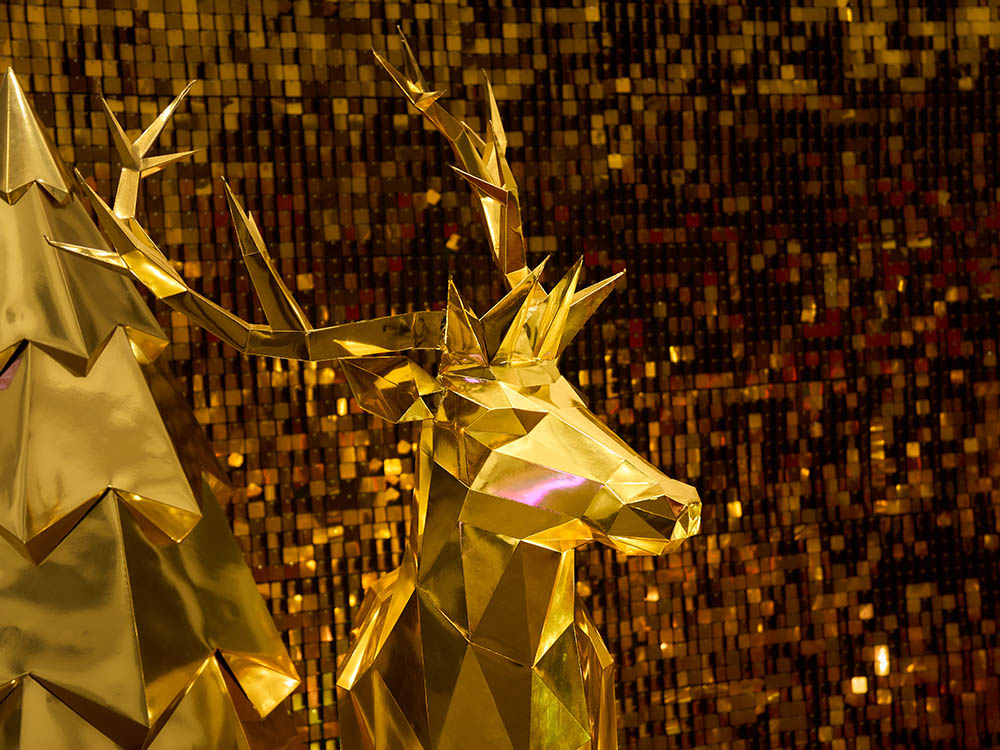 Подарите праздничное настроение своим коллегам, гостям и клиентам на новогоднем мероприятии с фотозоной, выполненной из золотых оленей с ёлкой. Такое украшение позволит сделать гостям яркие снимки рядом со стильными полигональными фигурами. Материал похожий на глянец будет переливаться в лучах вспышек делая каждый снимок неповторимым. Для какого формата подойдёт:- Офисные торжества;