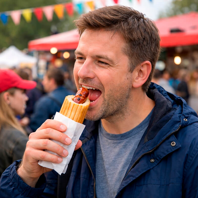 Главная изюминка французского хот дога - особая подача: вместо разрезанной вдоль булочки используется булочка с готовым отверстием, в который аккуратно вставляется сосиска. Свиная сосиска, горчичный соус, сырный соус и кетчуп, булочка.