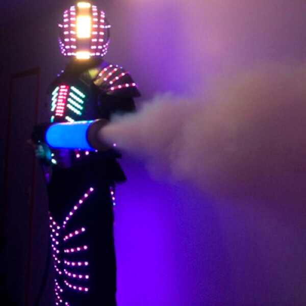 Устройство оснащается специальным рукавом высокого давления для присоединения баллонов с сухим льдом, что упрощает эксплуатацию и обслуживание. Длина выпускаемых потоков достигает внушительной дистанции до 8 метров, наполняя помещение густой иллюзией зимнего леса или космического пространства.