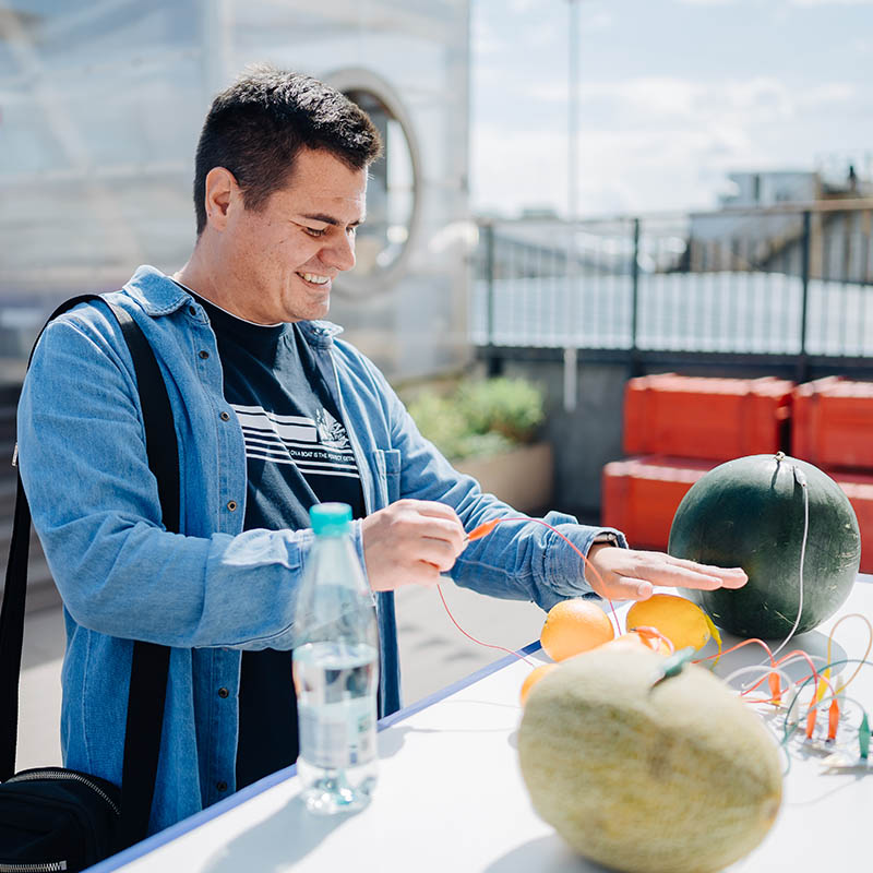 Вы когда-нибудь могли себе представить, что мелодию можно сыграть на апельсине и яблоках? Представляем вашему вниманию один из самых необычных аттракционов, который позволит превратить любой фрукт или овощ в музыкальный инструмент.