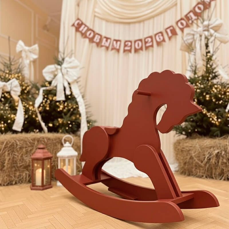 Создайте неповторимую праздничную атмосферу с очаровательной декоративной фигурой — классическим деревянным конем‑качалкой! Этот элегантный элемент декора привнесет в ваше мероприятие теплоту ретро‑стиля и волшебное новогоднее настроение.