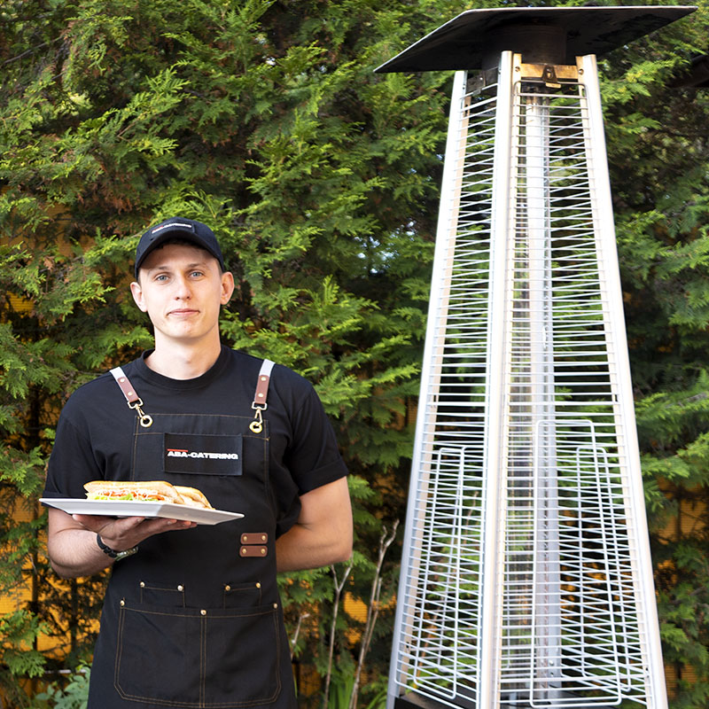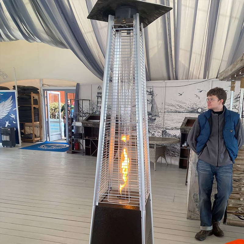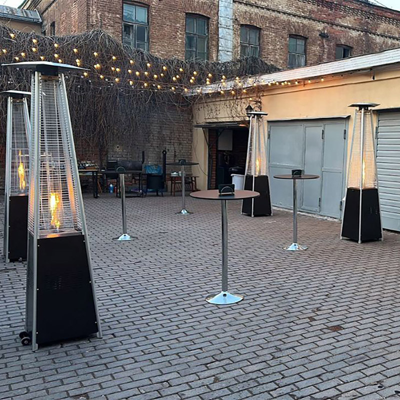 Уличный газовый обогреватель в виде пирамиды, изготовленный из высококачественной стали, имеет красивый дизайн и выглядит симпатично по отдельности. А в ночное время суток он создаст волшебную атмосферу.