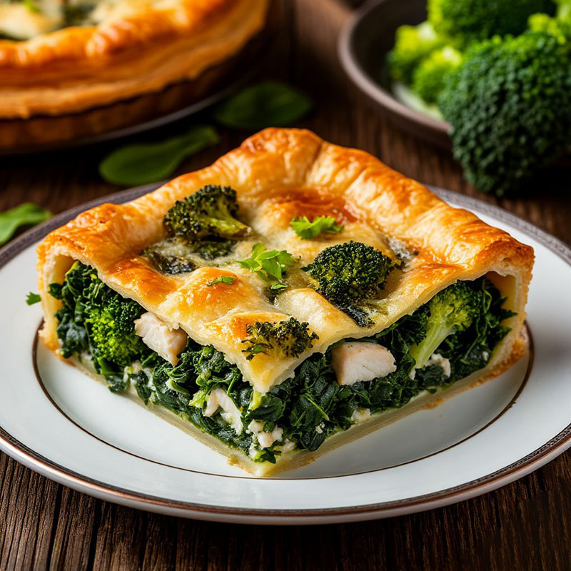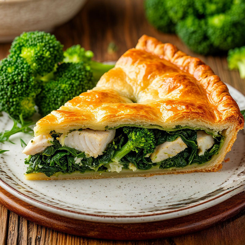 Мы создали удачное сочетание пользы и изысканного вкуса: нежный хек, обладающий легкой морской свежестью, прекрасно гармонирует с сочным шпинатом и кусочками брокколи, которые сохраняют приятную упругость после запекания. Тесто получается румяным и хрустящим снаружи, а внутри — мягким, оно деликатно обрамляет начинку, не перебивая ее вкус. Пирог отлично держит форму при нарезке, остаётся вкусным и в тёплом, и в остывшем виде.