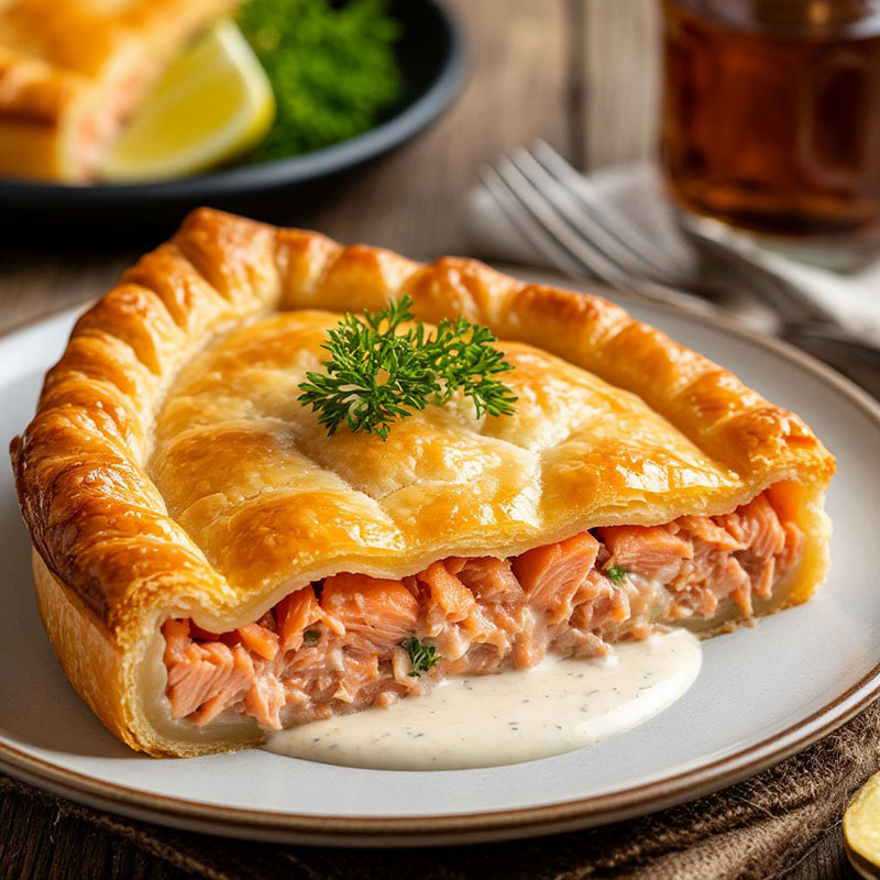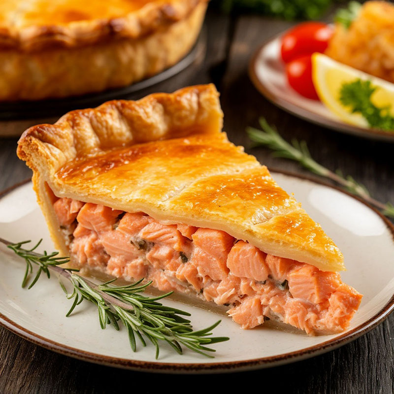 Нежный пирог с лососем в тонком тесте — сочетание изысканного вкуса и элегантной подачи. Идеально дополнит меню вашего мероприятия, оставив у гостей приятное гастрономическое впечатление.