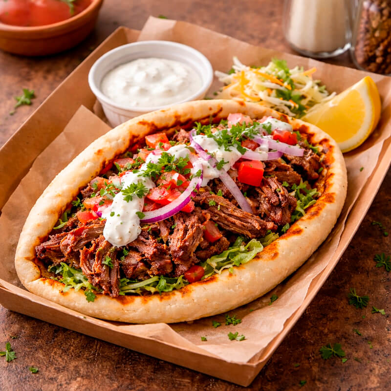 Пита с говядиной: гГовядина, салат китайский, лук, огурцы маринованные, огурцы свежие, соус чесночный, соус томатный, соус сырный, лук жареный. .