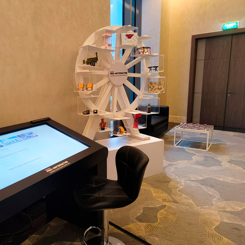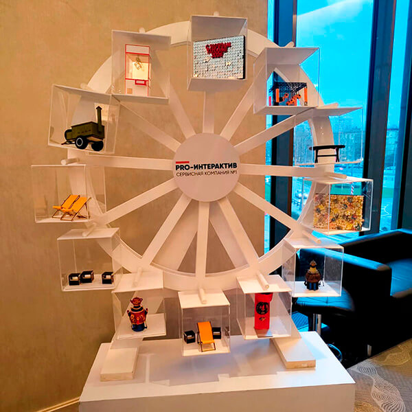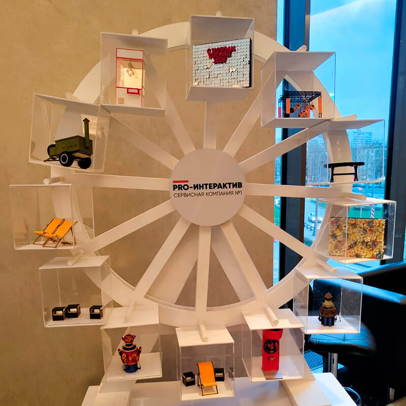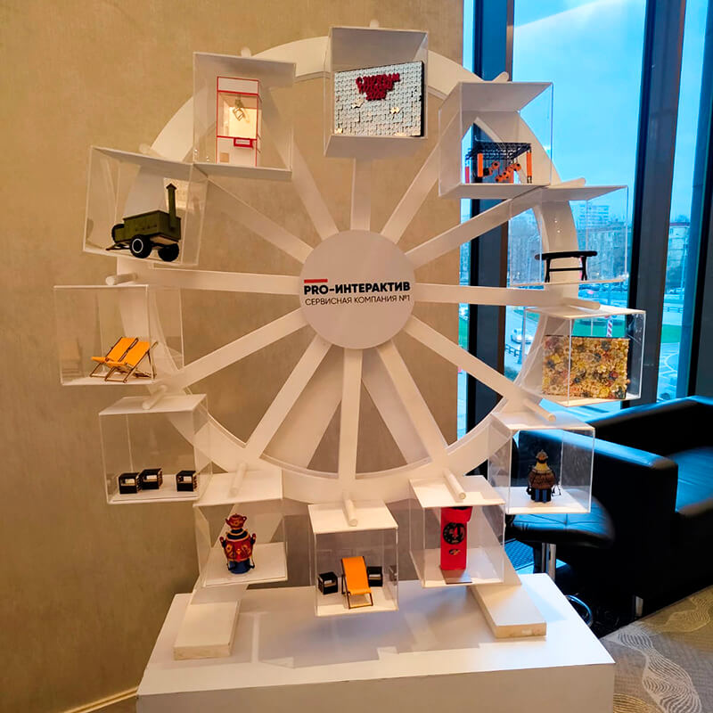 Хотите привлечь максимум внимания к своему бренду? Закажите нашу промо-карусель — эффектную копию маленького колеса обозрения с прозрачными ячейками для промо-продукции. Это интерактивный аттракцион, который автоматически раскручивается от малейшего прикосновения и превращается в магнит для взглядов.