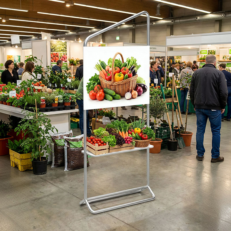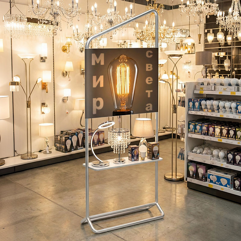 Используйте рекламный баннер, чтобы привлечь внимание покупателей и показать главные преимущества и уникальные черты продукта. Разместите образцы товара на широкой демонстрационной полке — так клиенты смогут сразу оценить его качество.