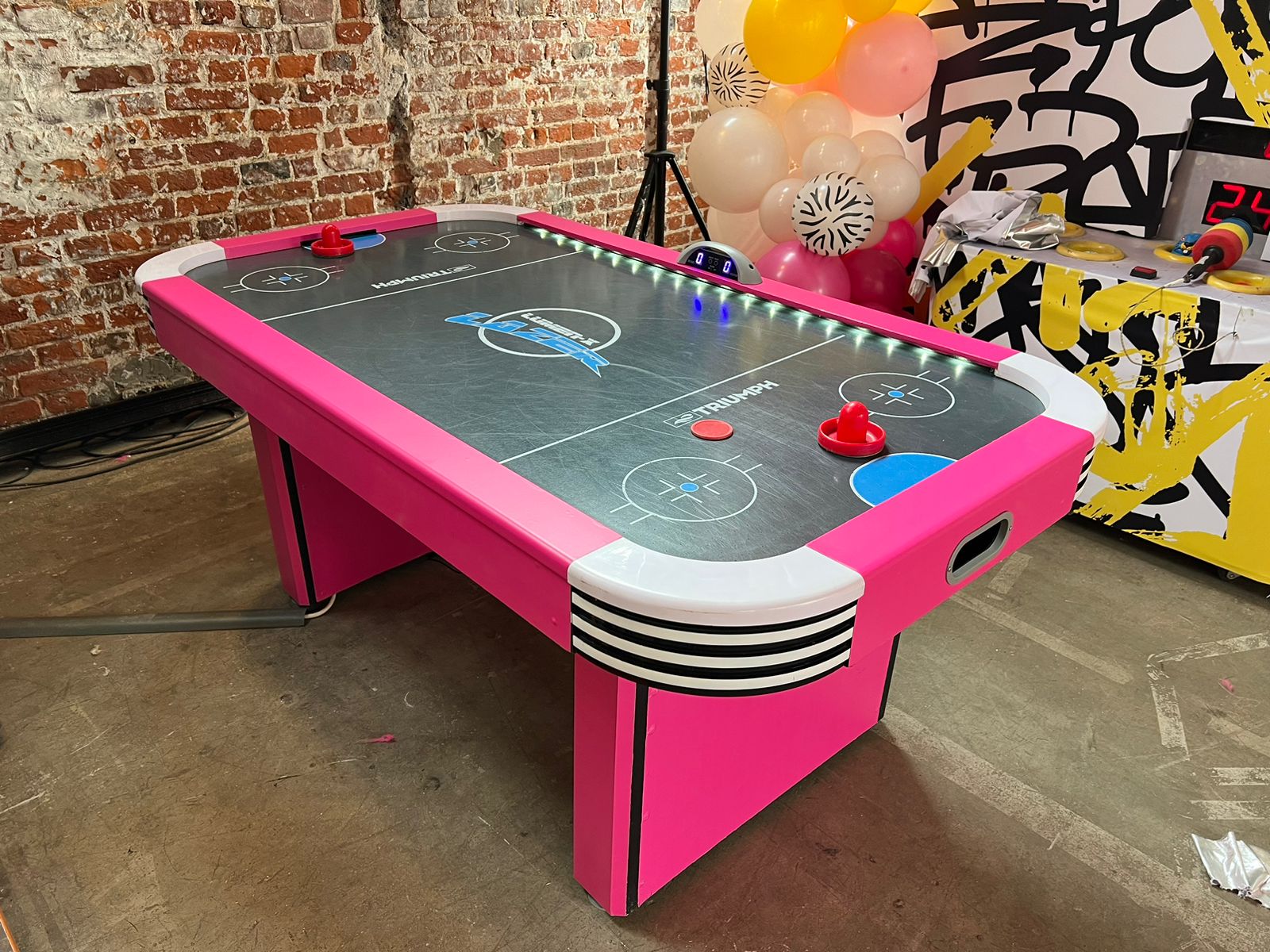 Аэрохоккей – популярная игра во всем мире, которая подходит для людей всех возрастов. Мы предлагаем украсить ваше мероприятие, посвященное 14 февраля или 8 марта, аэрохоккеем в розовом цвете, что дополнительно подчеркнет атмосферу праздника. В комплекте с игровым столом идут две специальные биты и две шайбы.