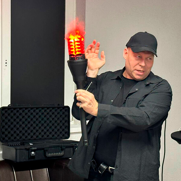 Светодиодный факел с эффектом дыма «Аква Флейм» – реалистичная имитация холодного пламени с безопасной технологией мелкодисперсного пара. Ультратихий, нечувствительный к нагреву, мгновенно реагирует на ветер. Параметры: размер 590×120×40 мм, вес каждого устройства 890 г, общая масса комплекта 5 кг, мощность потребления 24 Вт, расход жидкости 120 мл/ч. Поставка осуществляется в пластиковом кейсе, содержащем два устройства, шприц для дозаправки дистиллированной водой и зарядное устройство.