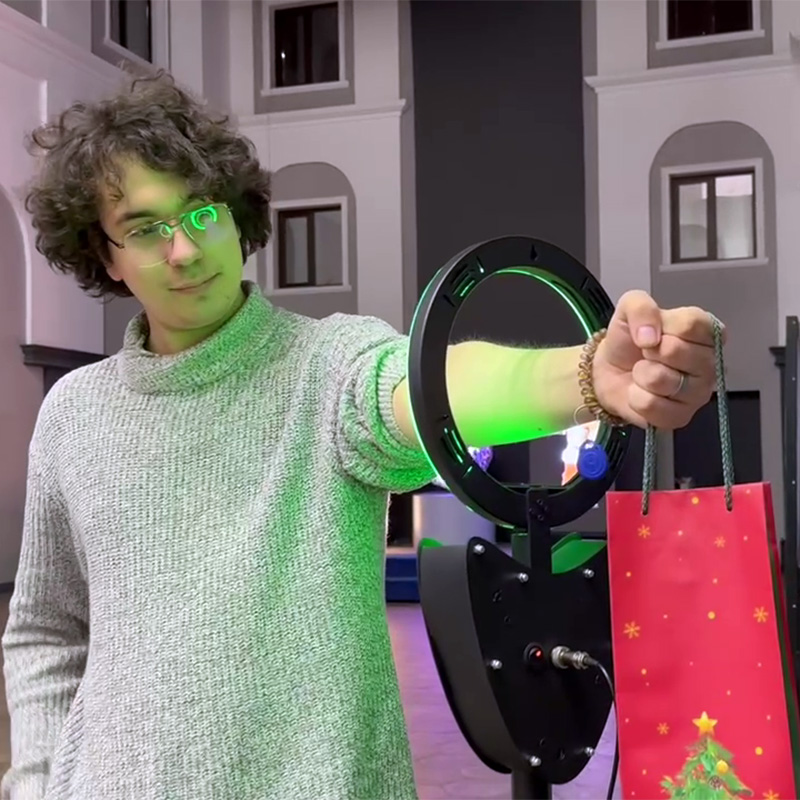 Участник подходит к стильной стойке с яркой круглой RGB‑лампой, в центре которой расположено отверстие.