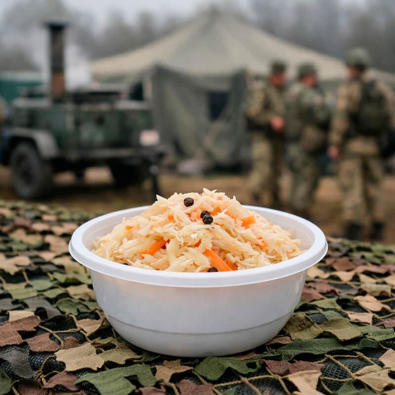 Капуста квашеная - хруст и лёгкая кислинка. Настоящая деревенская закуска к горячей каше. Селёдка с картофелем - нежное филе и отварной картофель. Свежие овощи - летнее настроение на столе. Эти простые, но душевные закуски сделают обед у полевой кухни по‑настоящему запоминающимся!