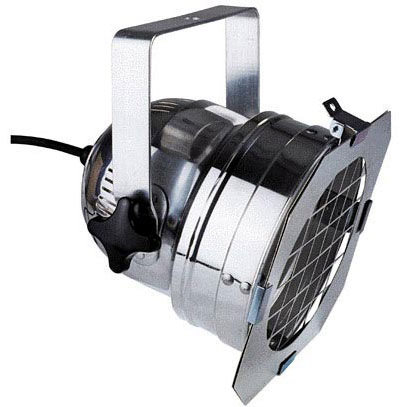 Прожектор PAR-56 генерирует интенсивный световой луч с фиксированным фокусом. Для получения концентрированного или рассеянного светового пучка достаточно сменить совместимые лампы. Это устройство отличается компактным дизайном, представленным в элегантном черном или блестящем хромовом цвете. В комплект поставки включены электрический шнур, держатель для светофильтра, разъем для лампы и защитная решетка. Монтаж лампы внутри корпуса осуществляется посредством пружинной фиксации.