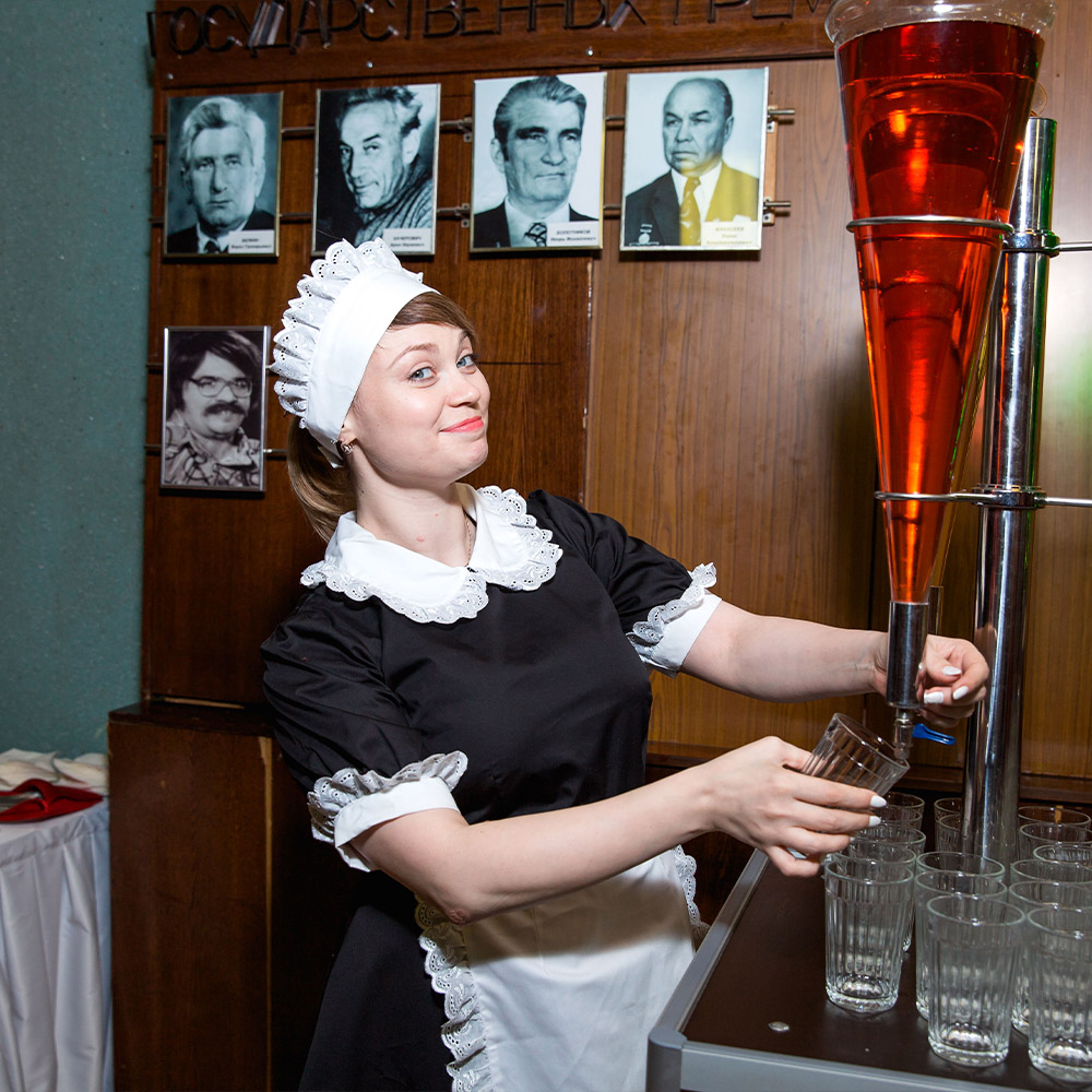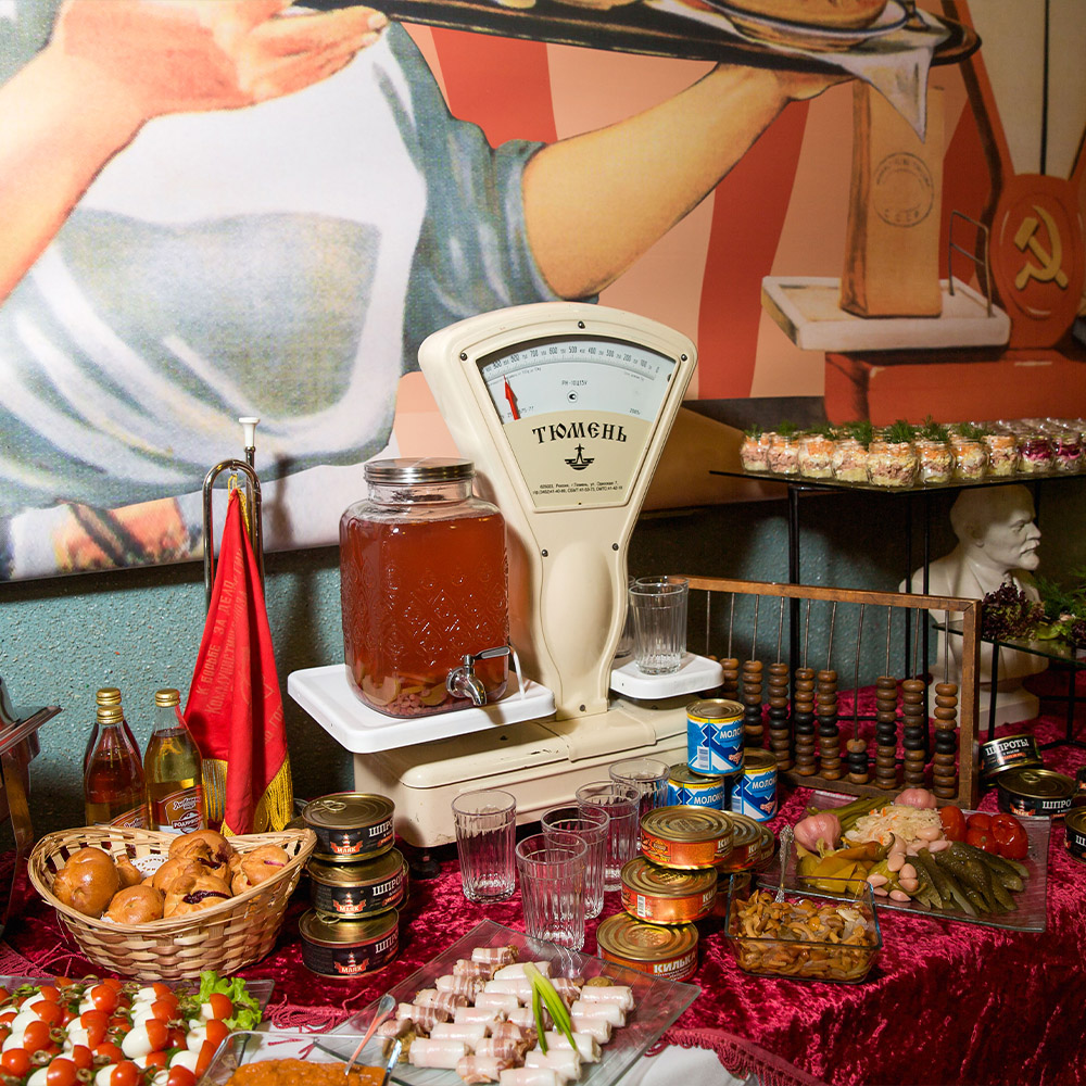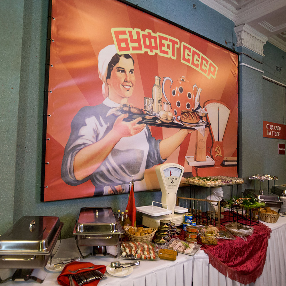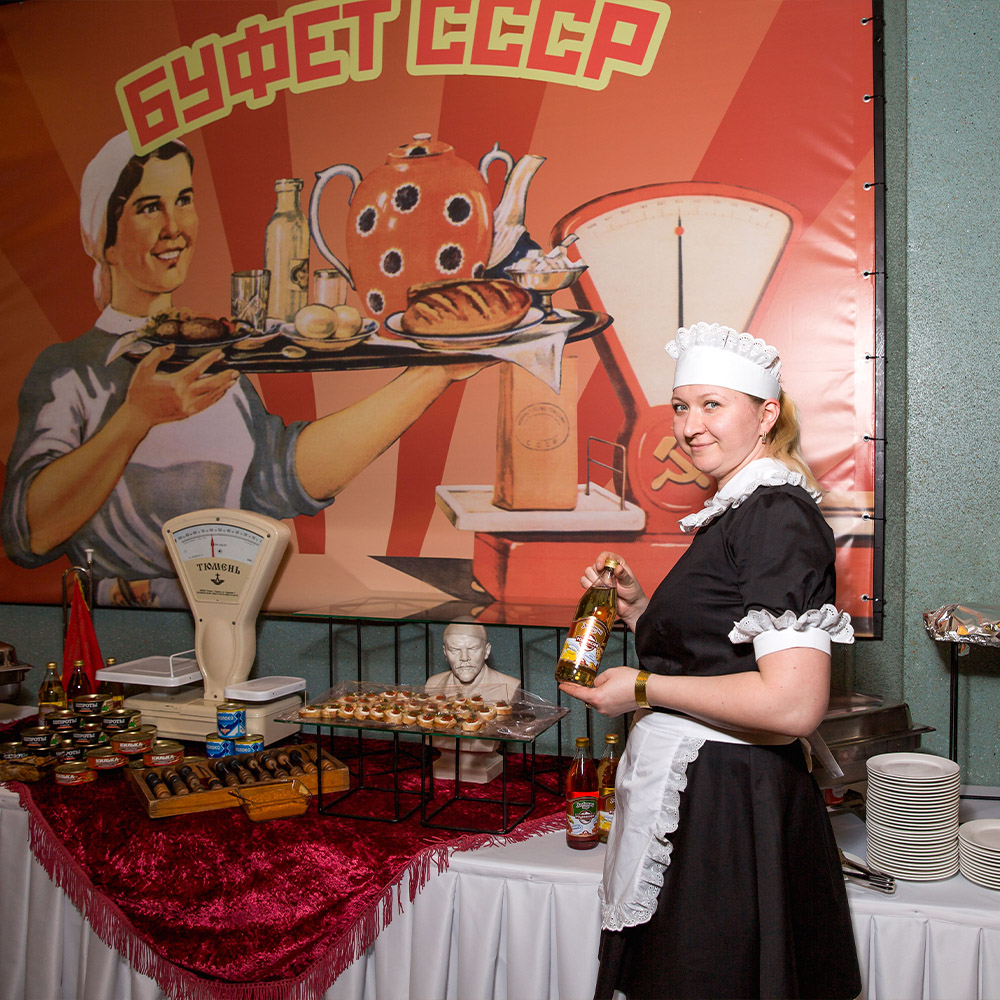 Оформили помещение, закуски и сами блюда в стиле первоклассного советского буфета. Предоставили аппараты с газ. водой и мороженным, стойки с сиропами.Предоставили официанток в форме буфетчиц, а сами блюда были выполнены в классике СССР.