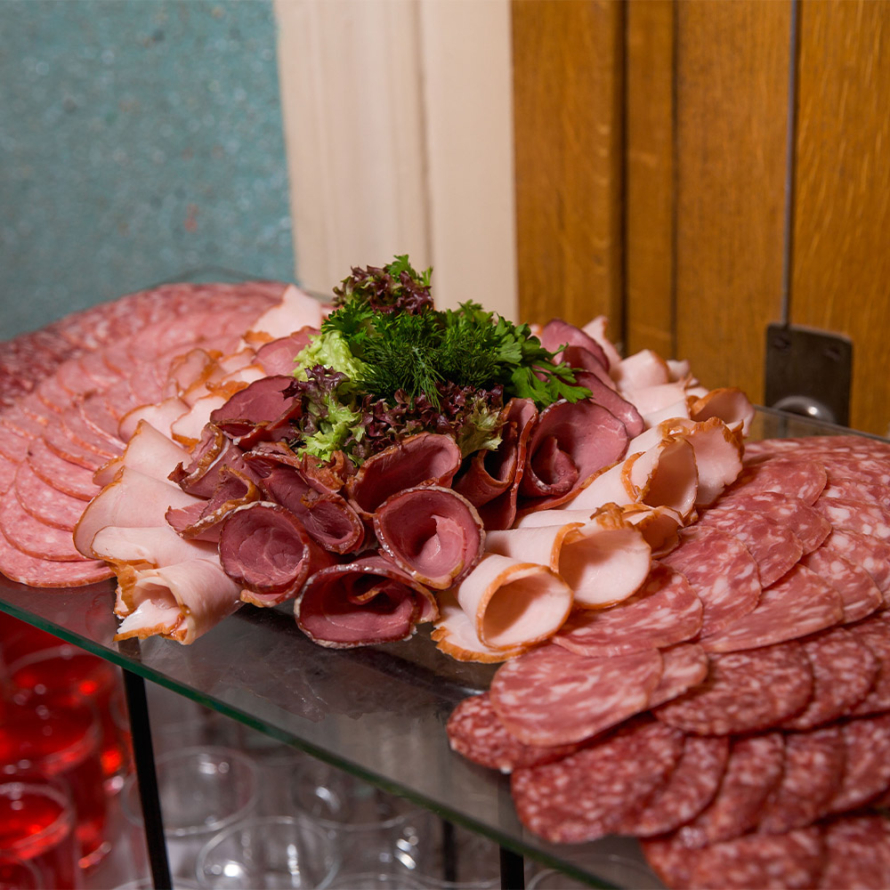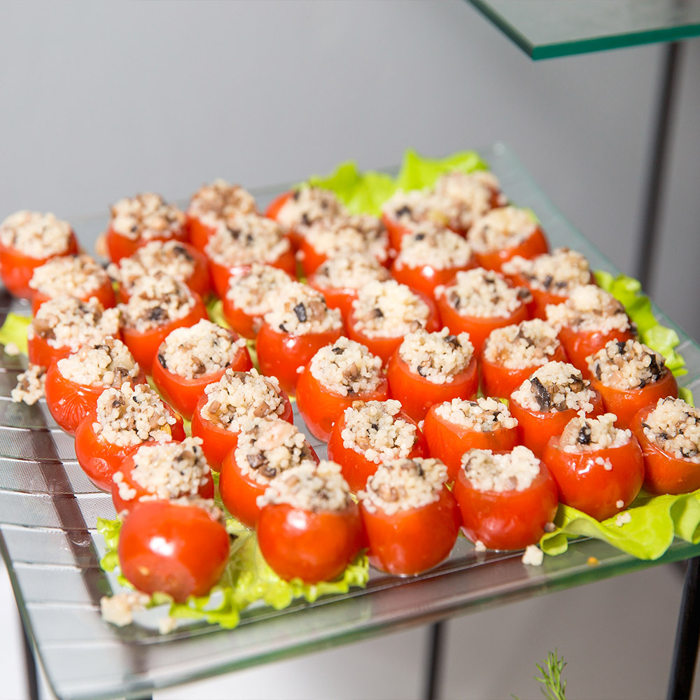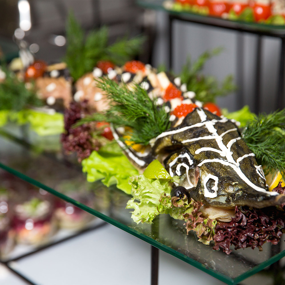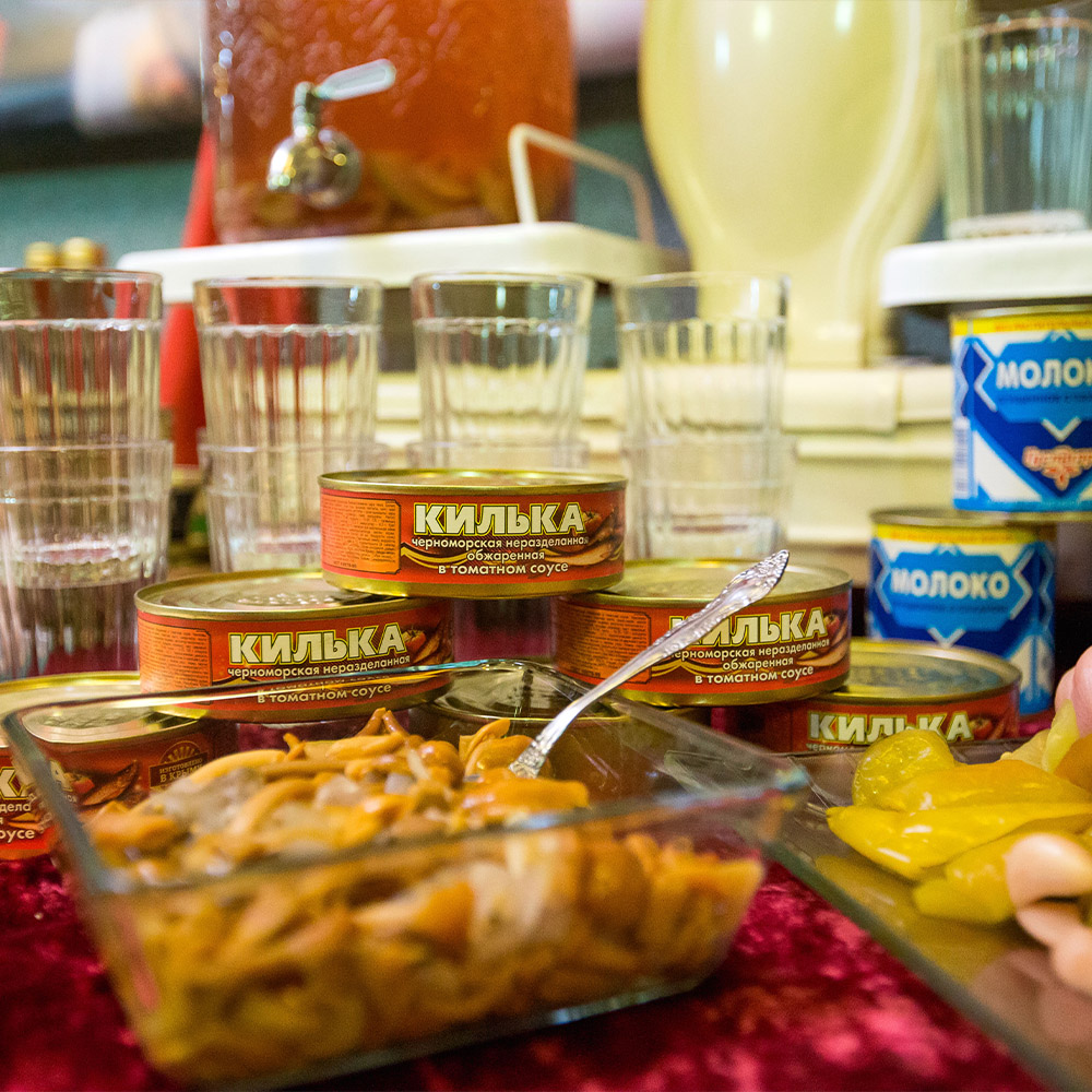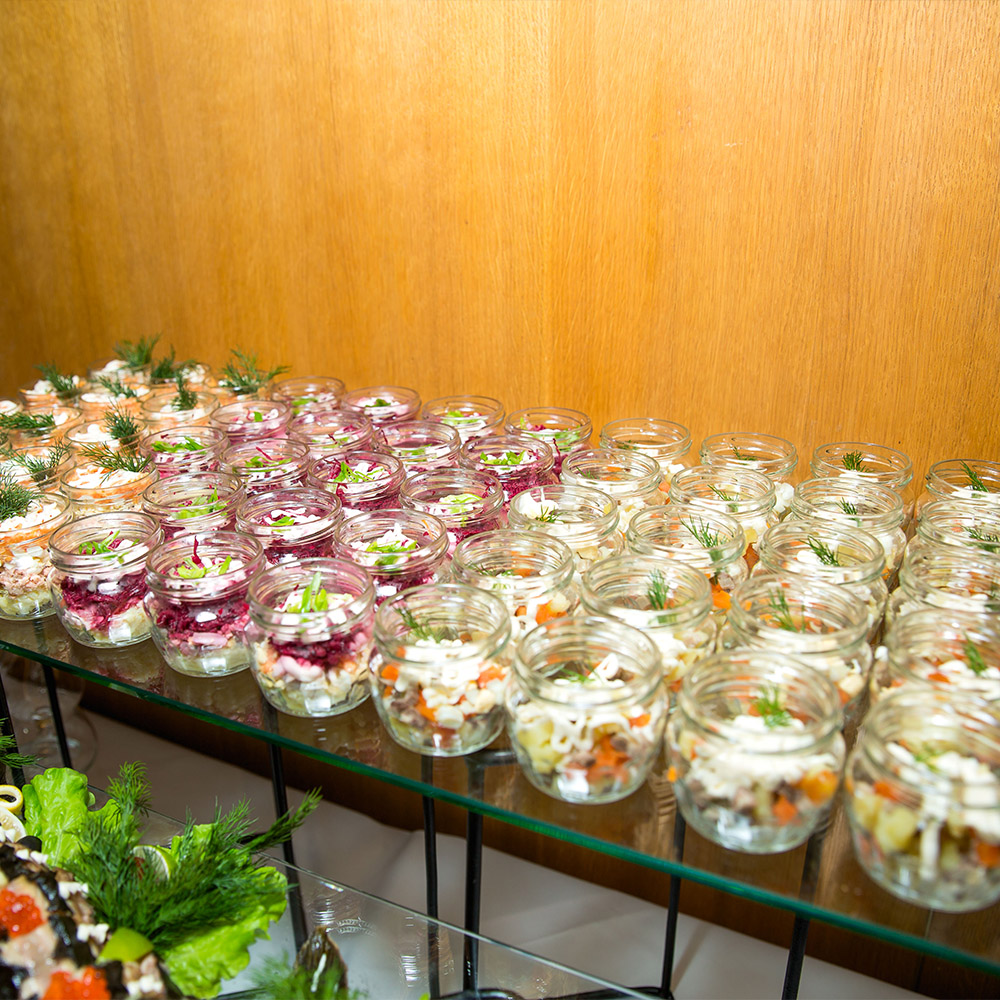 Оформили помещение, закуски и сами блюда в стиле первоклассного советского буфета. Предоставили аппараты с газ. водой и мороженным, стойки с сиропами.Предоставили официанток в форме буфетчиц, а сами блюда были выполнены в классике СССР.
