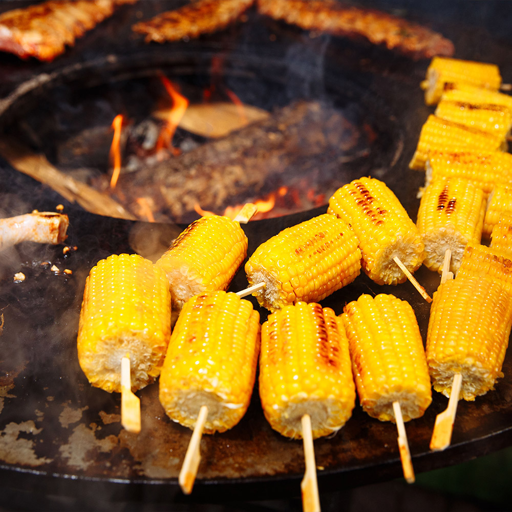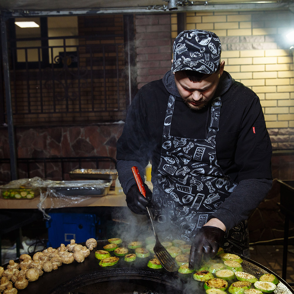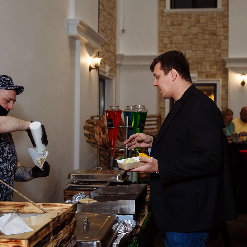 Организовали кейтеринг с барбекю и коптильной, с приготовлением блюд на уличной территории нашей площадки.