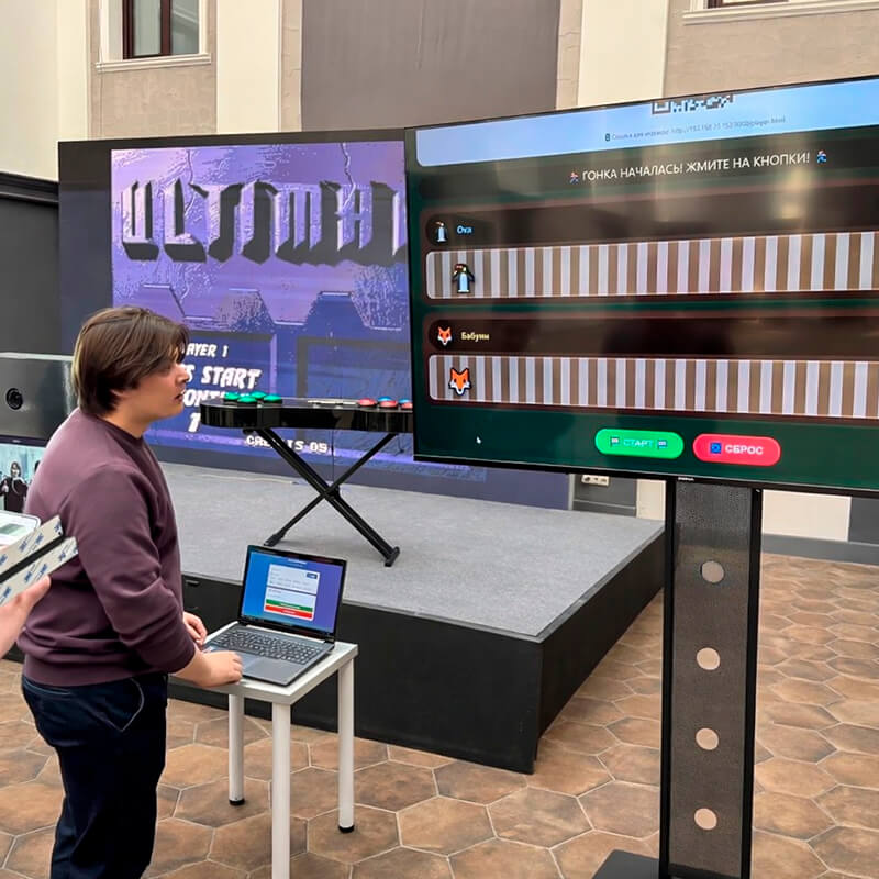 Аттракцион «Тапалка» — это динамичное интерактивное развлечение, которое идеально подходит для корпоративных мероприятий любого формата. Участники подключаются к системе через QR-код, переходят по ссылке на своих смартфонах и вводят имя и выбирают персонажа. После того как все готовы, оператор запускает игру, и начинается захватывающая гонка на скорость реакции.
