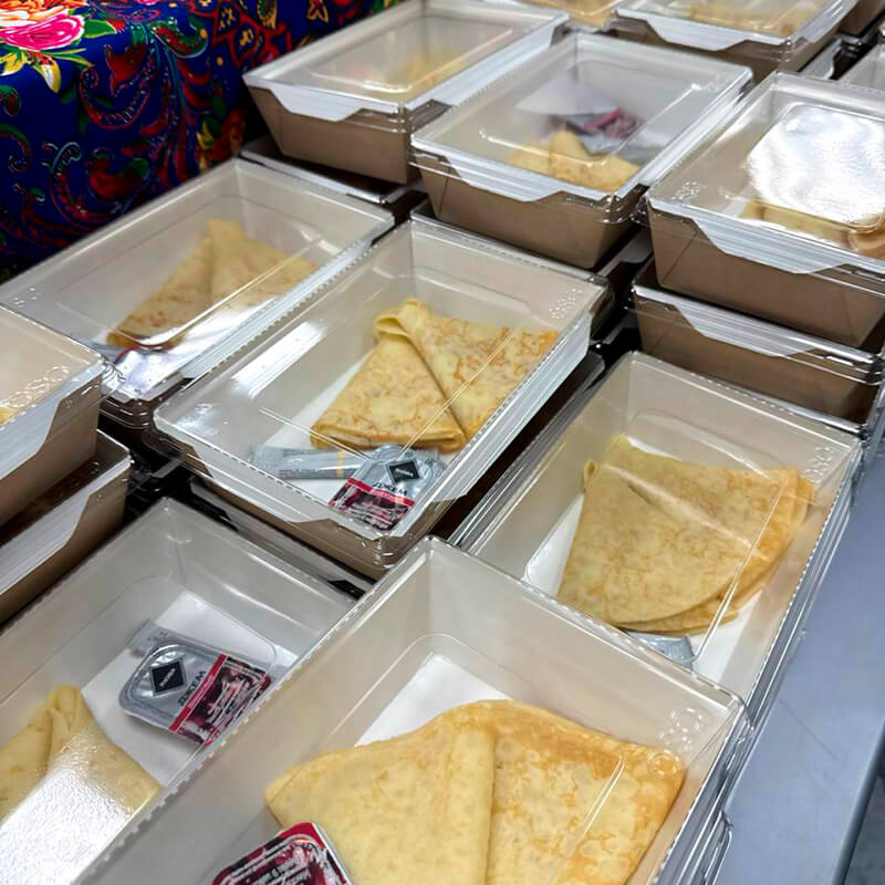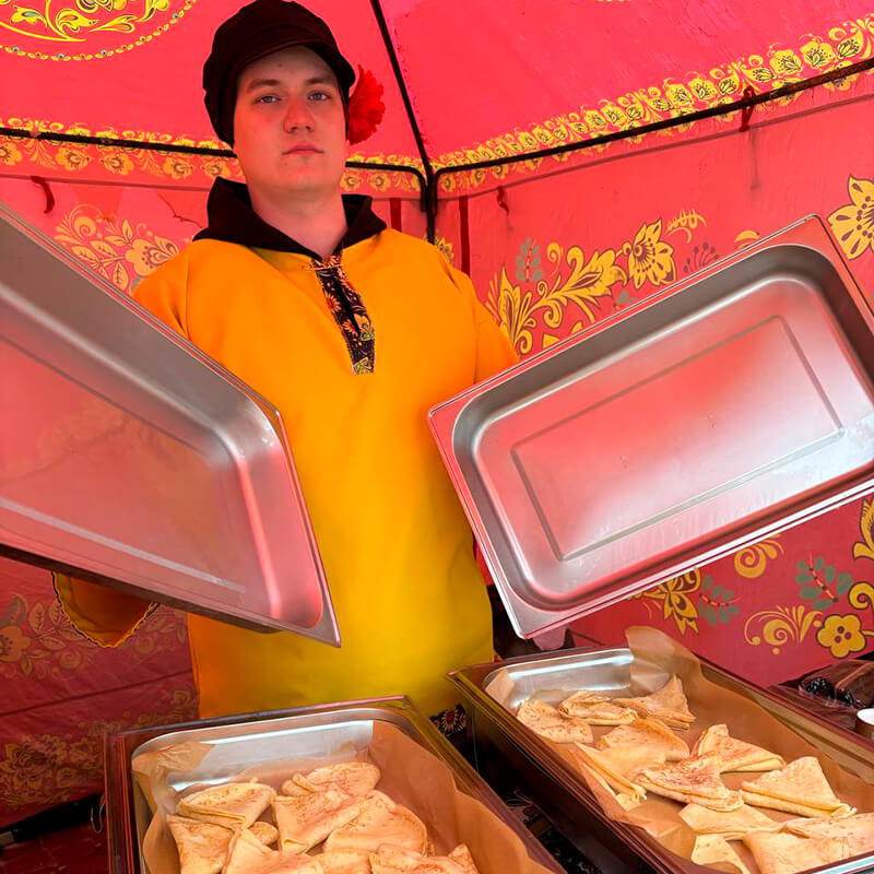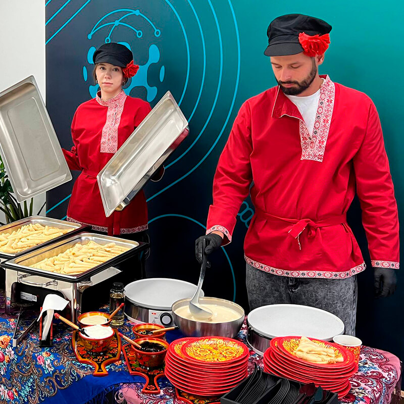 Погрузитесь в атмосферу настоящего народного праздника с нашей блинной станцией! Мы привезём всё необходимое оборудование и приготовим свежие, пышные блинчики прямо на глазах у гостей — это не просто угощение, а целое кулинарное шоу для ваших масленичных гуляний. Организуем праздничное гулянье: современное оборудование для быстрого и качественного приготовления блинов, опытные повара в праздничной русской одежде, стильная тематическая сервировка в народном стиле, мебель, посуда. Возможно доставка готовых блинов разного размера и начинками.