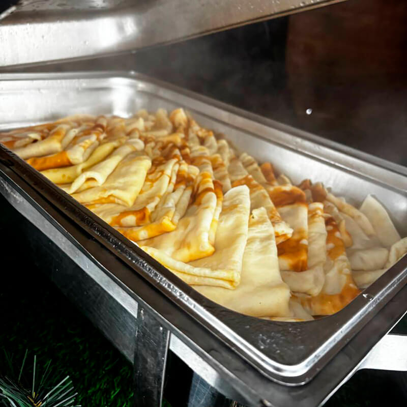 Тонкие и нежные, приготовленные по классической рецептуре из свежих ингредиентов, идеально пропечённые, с золотистой корочкой. Закажите блины в уже готовом виде или арендуйте комплексную блинную станцию, чтобы угощения готовились прямо на вашем празднике.