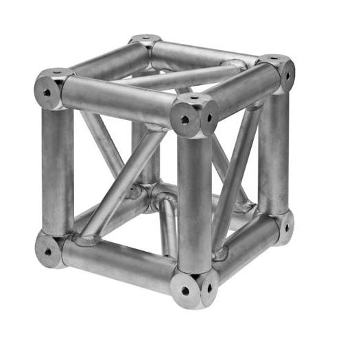 PROLYTE BOX-30V-0 — незаменимый компонент для сборки фермовых конструкций PROLYTE в разнообразные геометрические формы. Этот угловой бокс, выполненный в виде эргономичного куба, способен соединять до шести элементов ферм квадратного сечения, обеспечивая точные соединения под углом 90°. Он разработан специально для использования в единой стропильной системе средней нагрузки 30-й серии ферм Prolyte H30V, что делает его оптимальным для подвеса светового оборудования на концертных площадках, в выставочных павильонах и на рынках. Кубик гарантирует высокую прочность крепления, адаптивность в применении, а также компактность при хранении и перемещении. Благодаря своей многогранности, PROLYTE BOX-30V-0 пользуется большим спросом не только как ключевой элемент сборки, но и как эстетичный декоративный акцент для ТВ-съемок. Сочетание скромных габаритов и идеальной кубической конфигурации делает бокс-корнер 30V идеальным для визуализации на дисплеях и последующей физической реализации фермовых систем. Он позволяет легко создавать высокотехнологичные дизайны, включая угловые и круговые элементы, предоставляя элегантное и функциональное решение для построения фермовых периметров и объемных структур любого масштаба, заменяя более массивные специализированные угловые элементы на 2, 3, 4, 5 и 6 направлений.