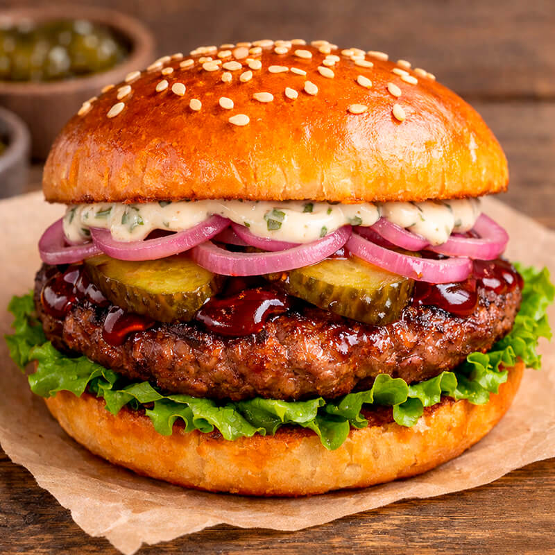 Булочка, говяжья котлета, огурец маринованный, лук маринованный, соус тар-тар, соус барбекю, салат листовой.