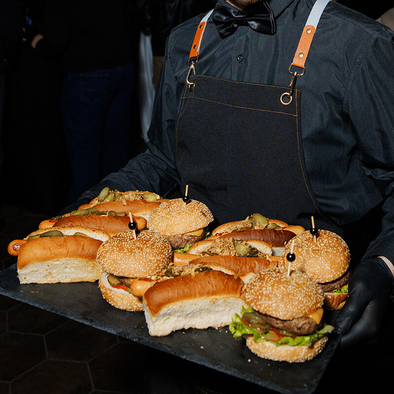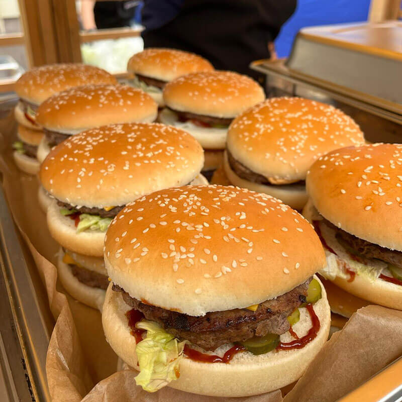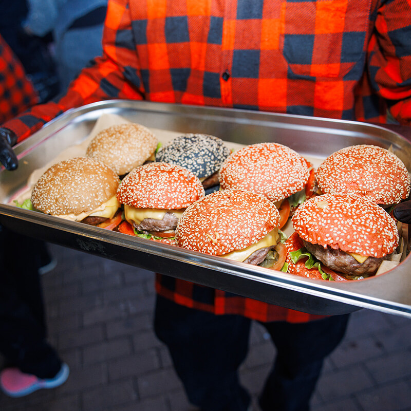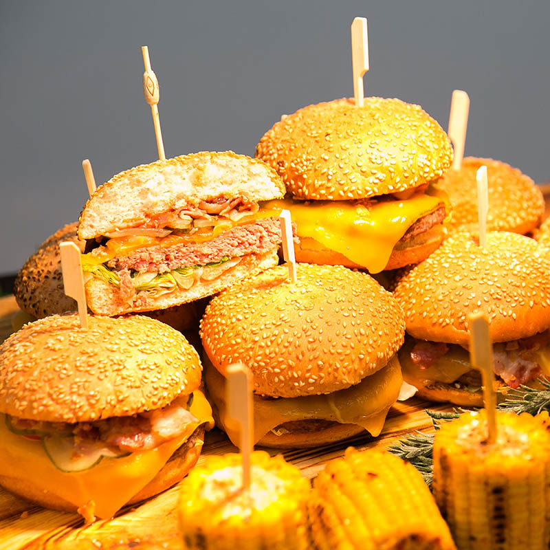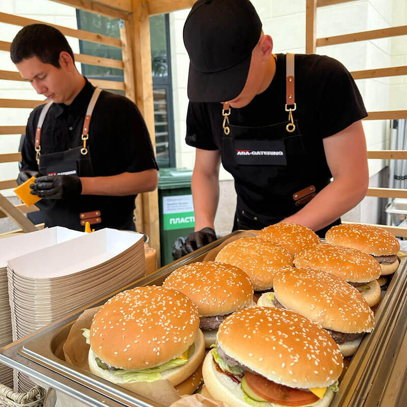 Наш сервис предлагает возможность насладиться свежими и вкусными бургерами прямо на вашем мероприятии. Мы привозим готовые блюда или устраиваем точку приготовления на месте, создавая атмосферу настоящего праздника еды. Накормите ваших гостей настоящими деликатесами, такими как традиционные русские гамбургеры с нежнейшей говяжьей котлетой, хрустящими маринованными огурцами и луком, фирменными соусами тар-тар и барбекю, украшенные свежей зеленью салата. Каждая порция весит примерно 200 грамм, что гарантирует сытость и удовольствие каждого гостя.