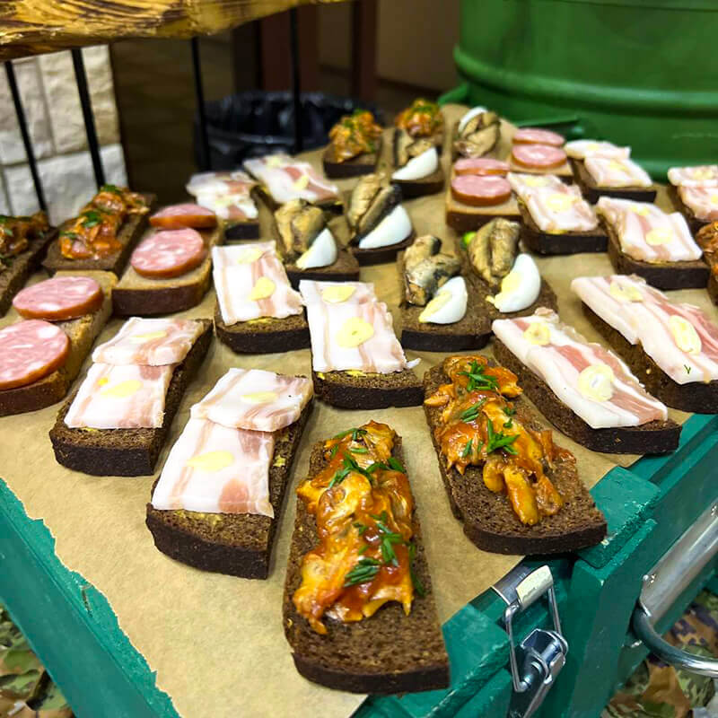 Эти простые, сытные и любимые всеми бутерброды идеально впишутся в тематику вашего торжества, особенно если оно приурочено ко Дню защитника Отечества (23 февраля), Дню Победы (9 мая) или другим военно-патриотическим праздникам. Но даже если ваше мероприятие носит иной характер — корпоратив, пикник или фуршет на природе — наша услуга станет прекрасным решением для насыщенного и уютного застолья.