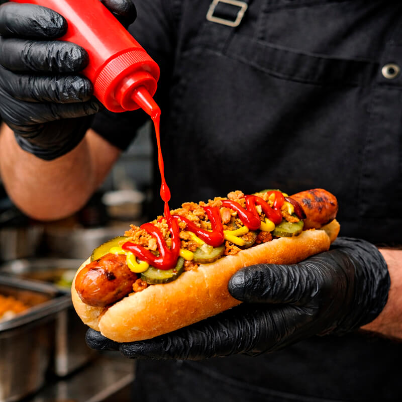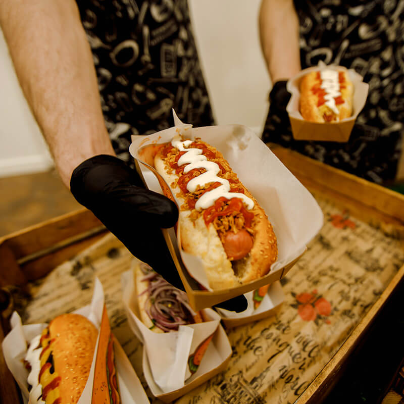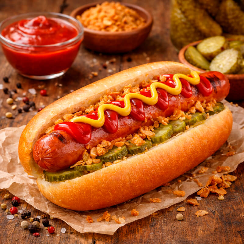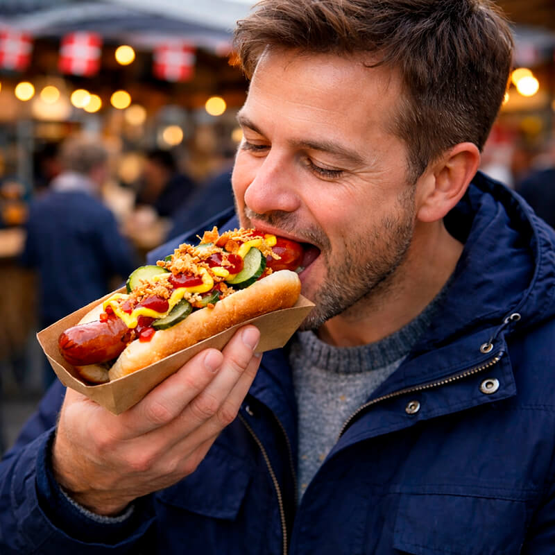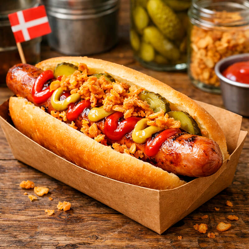 Погрузитесь в атмосферу скандинавского стритфуда с датским хот-догом с колбаской «Гриль Свиная» — сытным и ароматным перекусом с узнаваемым вкусом, который давно покорил улицы Копенгагена и теперь доступен для вашего мероприятия. Компания ПРО-Интерактив предлагает профессиональный выездной кейтеринг: мы привозим готовые свежие хот-доги или организуем полноценную точку приготовления прямо на площадке, создавая эффектное гастрономическое шоу для гостей. Датский хот-дог выгодно отличается от других вариантов фастфуда продуманным составом и гармонией вкусов: мягкая датская булочка, сочная свиная колбаска гриль с аппетитной золотистой корочкой, хрустящий лук фри, маринованные огурцы с лёгкой кислинкой, а также классические соусы — кетчуп и пикантная горчица, которые подчёркивают вкус основных ингредиентов. Порция весом 170 граммов отлично подойдёт как для быстрого перекуса, так и для сытного угощения на празднике. Горячие датские хот-доги станут отличным решением для корпоративов, вечеринок, детских праздников, фестивалей и open-air мероприятий.