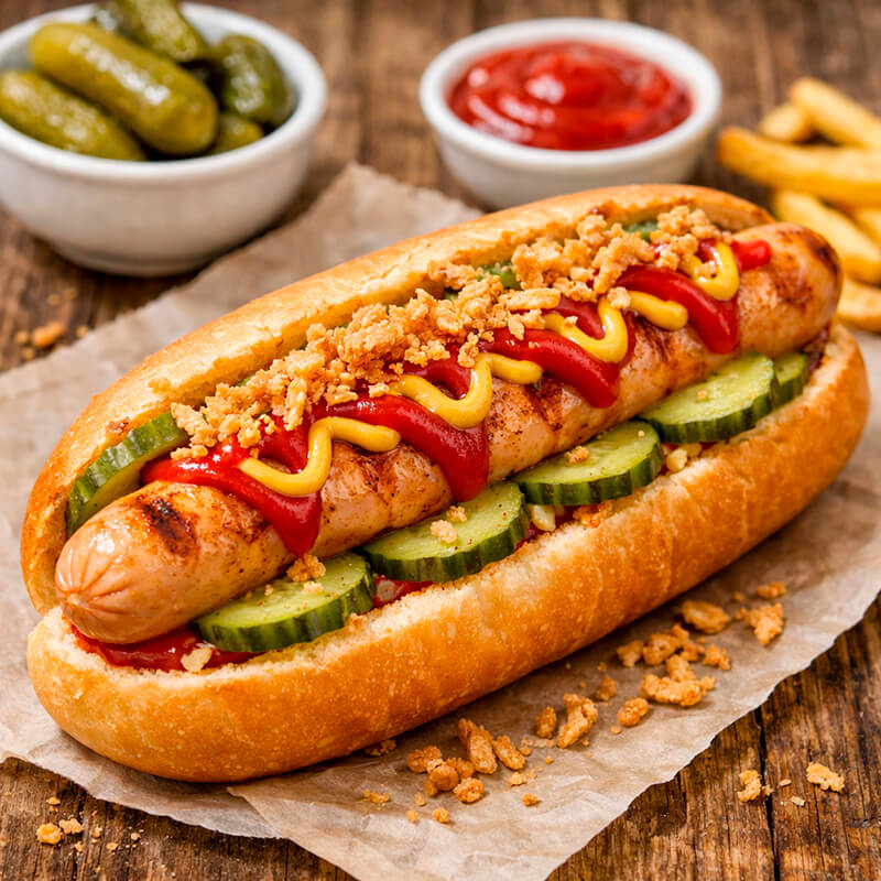 Датский хот-дог с куриной сосиской «Гриль» — популярный скандинавский стритфуд, который отлично подходит для мероприятий любого формата. Сытный, горячий и узнаваемый по вкусу, он станет удачным выбором для вечеринки, детского праздника, корпоратива или фестиваля. В мягкой датской булочке — сочная куриная сосиска гриль, маринованные огурцы, кетчуп и пикантная горчица, дополненные хрустящим луком фри и золотистыми луковыми чипсами. Такое сочетание даёт баланс насыщенного вкуса, лёгкой кислинки и приятного хруста. Вес порции — 170 г.