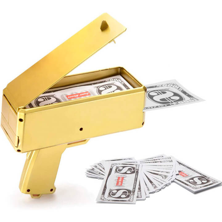 Money Gun — это оригинальный денежный пистолет золотистого цвета, позволяющий устроить незабываемый денежный дождь из реальных или сувенирных купюр. Надёжный и безопасный дизайн, простое управление и игривая атмосфера праздника сделают ваше мероприятие особенным. Отлично подойдёт для розыгрышей, вручения премий, корпоративных вечеров и свадебных торжеств. Изделие выполнено из пластика, снабжено стандартными батарейками типа AA и весит всего 250 граммов.