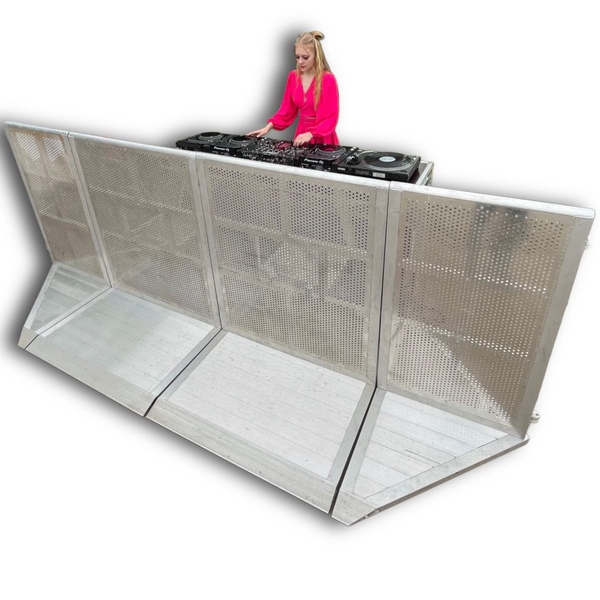 Представляем вашему вниманию усиленную DJ-стойку с интегрированным алюминиевым фан-барьером, доступную для аренды. Это оптимальный выбор для ди-джеев и ведущих, чья работа проходит среди оживленной аудитории, где критически важны как стабильная платформа для аппаратуры, так и надежная, эстетичная и современная защитная конструкция. Данная система обеспечивает исключительную устойчивость, предотвращая нежелательные перемещения, и при этом крайне удобна в транспортировке, что делает ее идеальной для широкого спектра мероприятий – от частных вечеринок до масштабных уличных концертов. Кроме того, в конструкцию барьера предусмотрена специальная площадка для персонала охраны.