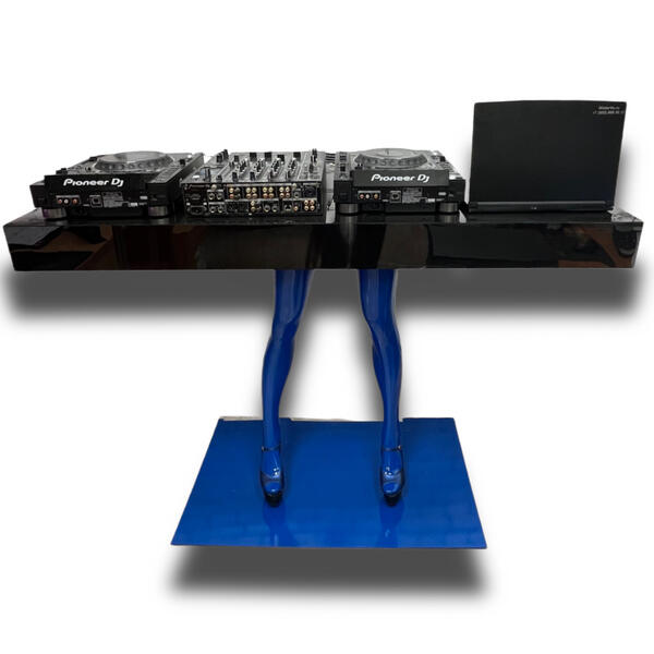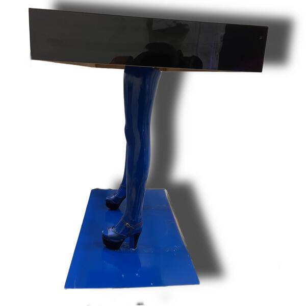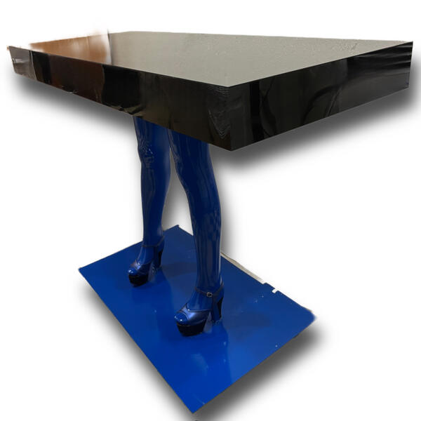 Эффектная, блестящая столешница покоится на едва различимом металлическом основании. Неожиданным элементом дизайна служат синие манекенные ноги, удивительным образом справляющиеся с кажущейся массивностью верхней плиты.