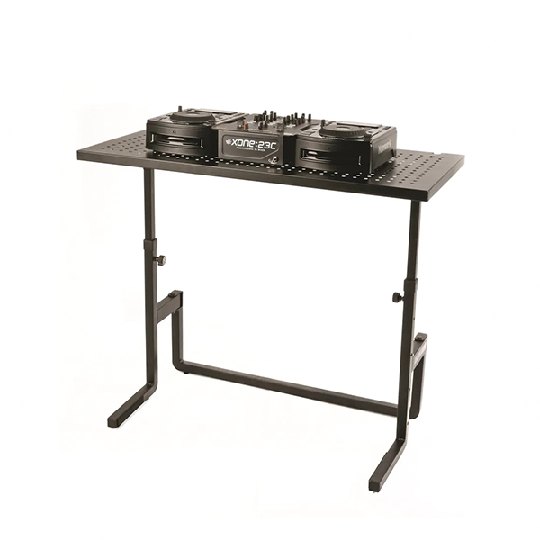 Универсальный мобильный стол для диджеев, отличающийся прочностью и удобством в перевозке. Выполнен из черной анодированной стали, оснащен регулируемыми по высоте ножками (64-97 см) и легким складным механизмом. Благодаря перфорированной столешнице обеспечивается эффективная вентиляция оборудования. Максимальная нагрузка — до 90 кг, масса самого стола — всего 1,25 кг. Идеален для установки микшеров, проигрывателей и контроллеров, дополнительно расширяется аксессуарами для ноутбуков и планшетов.
