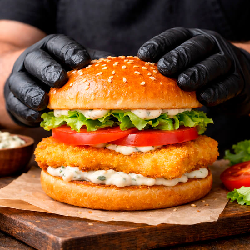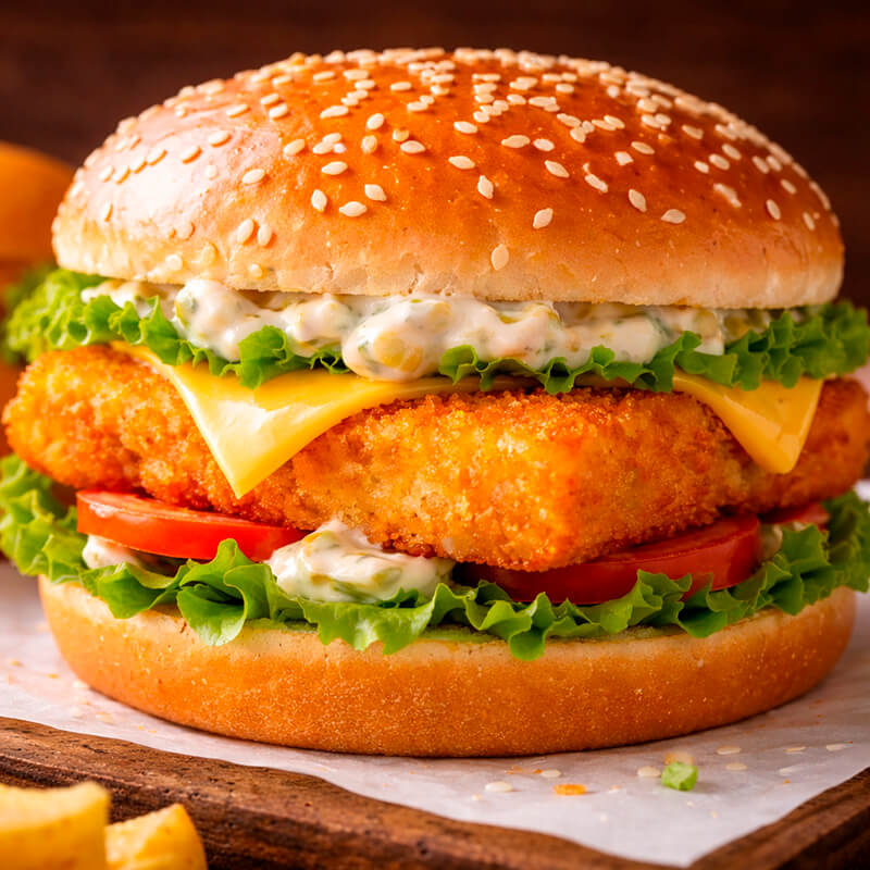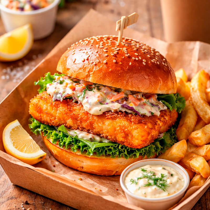 Организация незабываемого угощенияДля каждого заказа мы выбираем лучшее сочетание ингредиентов, создавая идеальное блюдо, которое оставит приятные впечатления у ваших гостей. Фишбургер включает мягкую пшеничную булочку, сочное филе рыбы в хрустящей панировке, пикантный соус тартар, свежие овощи и листики салата айсберг. Вес одной порции составляет примерно 200 грамм.
