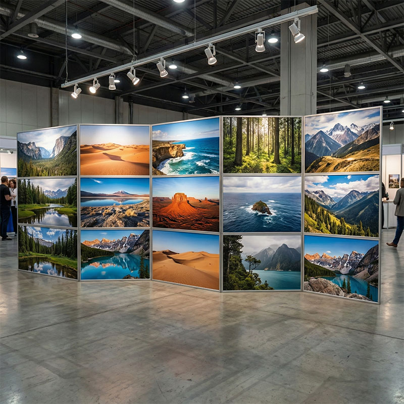 Планшетный (ширмовый) стенд с оригинальной горизонтальной конфигурацией, отличающийся увеличенной шириной каждой секции и общей высотой, составляющей три секции.