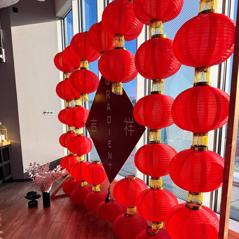 Добро пожаловать в атмосферу восточного праздника: яркая композиция из множества красных фонарей, аккуратно выстроенных в геометрическом порядке, создает эффектный фон для памятных снимков. В центре композиции — стильная таблица, которую вы можете кастомизировать по своему усмотрению: оклейка логотипами или оформление с помощью кастомной неоновой вывески.