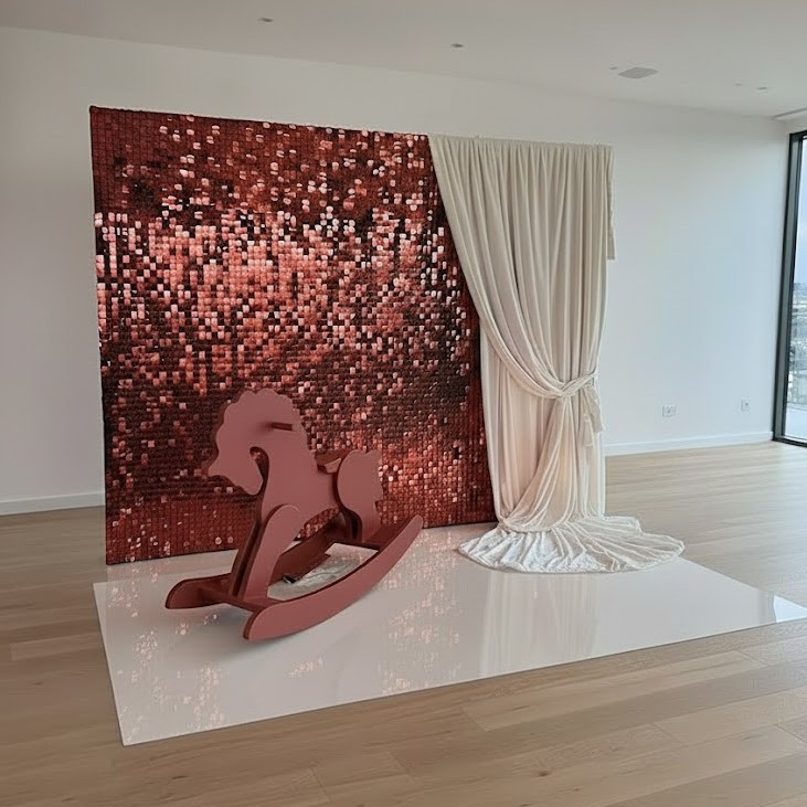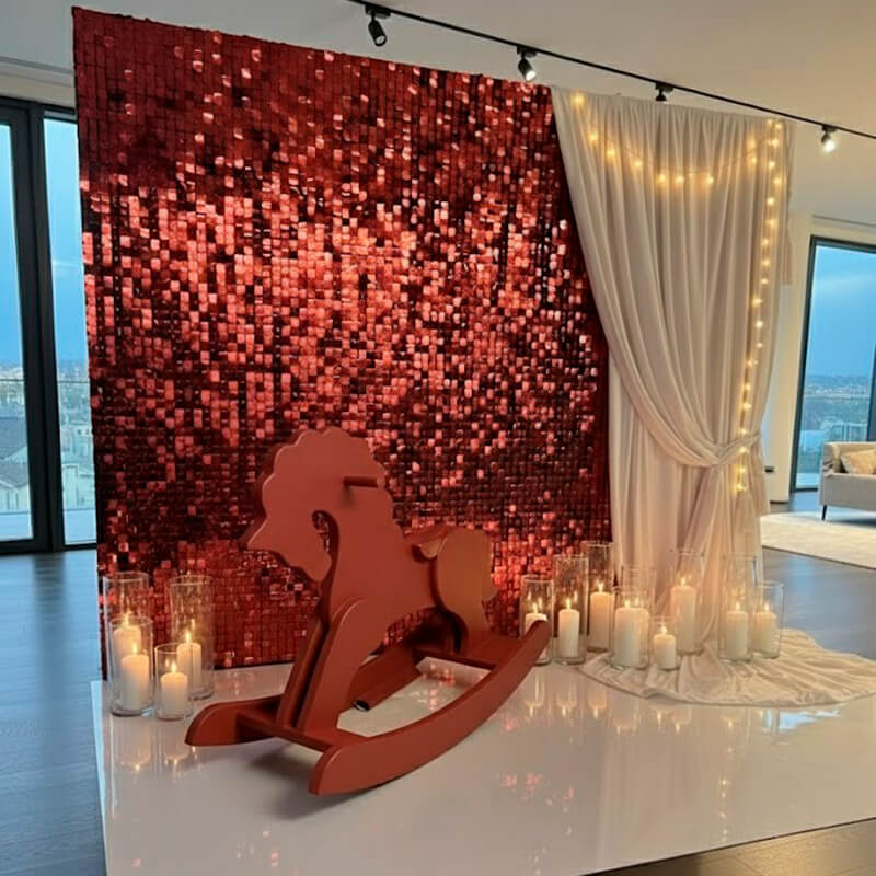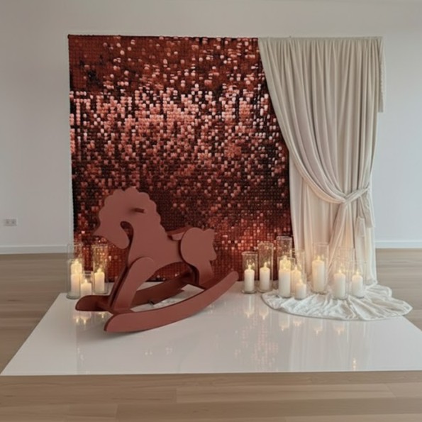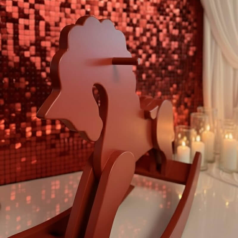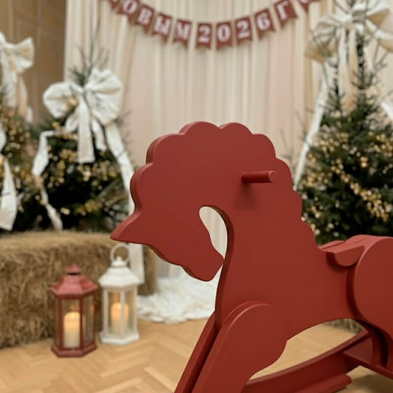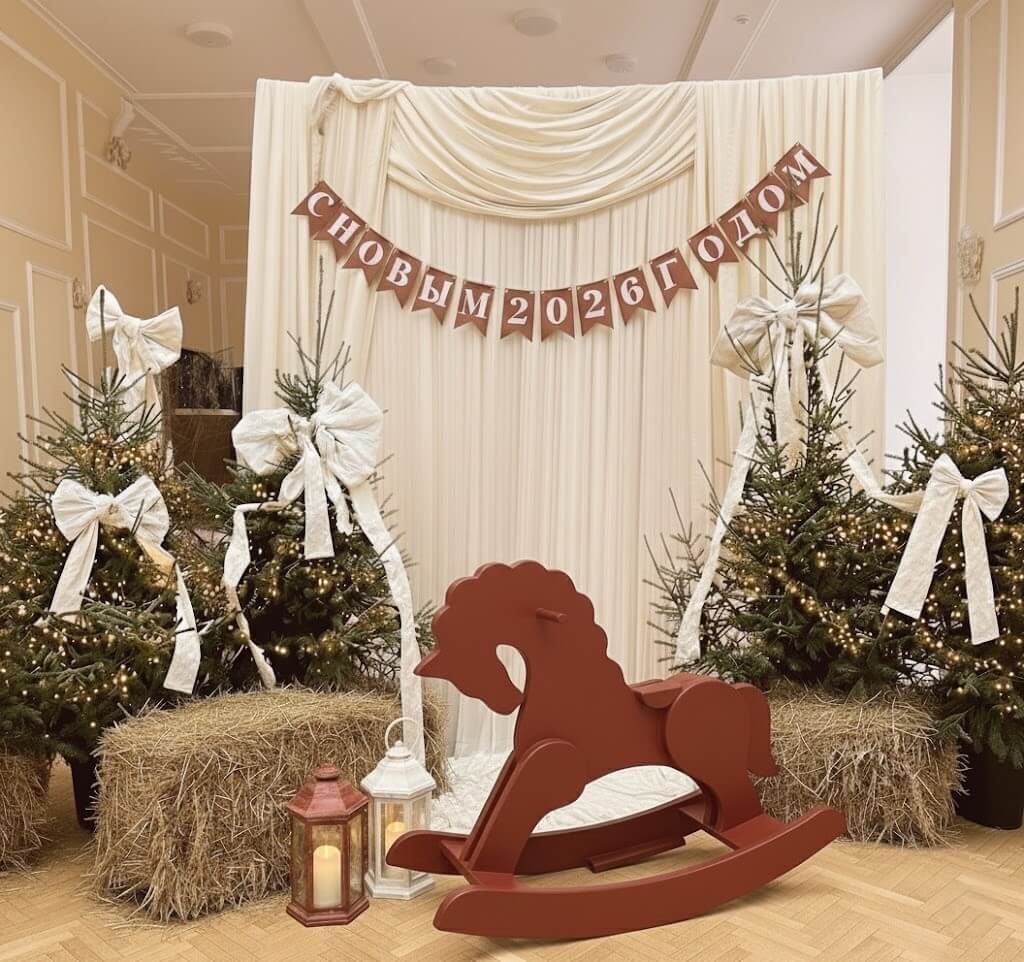 Подарите своим гостям сказочную атмосферу Нового года с оригинальной фотозоной, оборудованной роскошной стеной из пайеток и очаровательным деревянным конем-качалкой. Ваша площадка преобразится благодаря уникальному оформлению и профессиональному монтажу «под ключ».