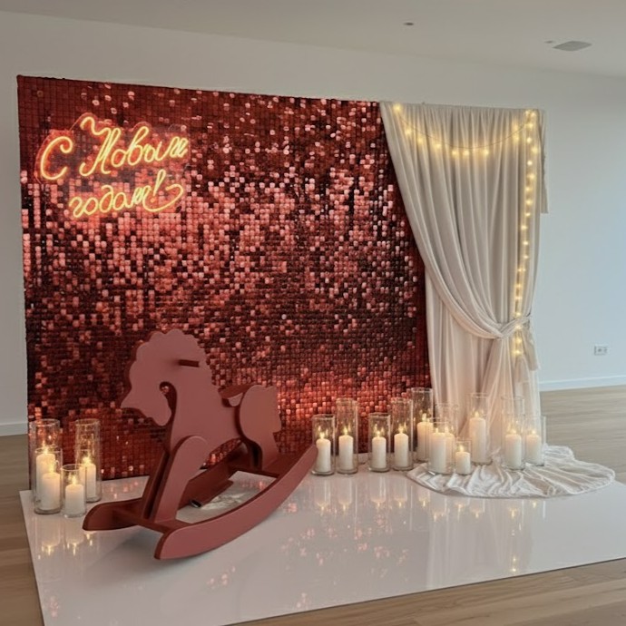 Аренда фотозоны с деревянным конем и пайетками на Новый Год