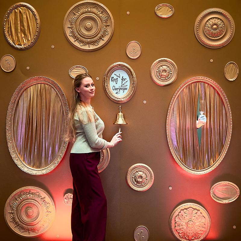 На стене, украшенной элементами в стиле барокко, висит колокольчик. Если позвонить в него, то гостям предложат бокал шампанского: когда раздается звон колокольчика, из стены выдвигаются руки в изящных белых перчатках и преподносят гостю бокал с игристым напитком. Такая фотозона не только украсит любое мероприятие, но и станет удобным способом подачи напитков.