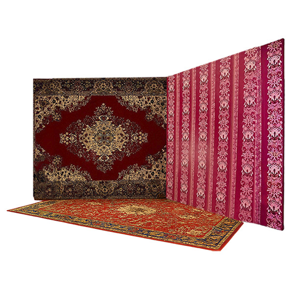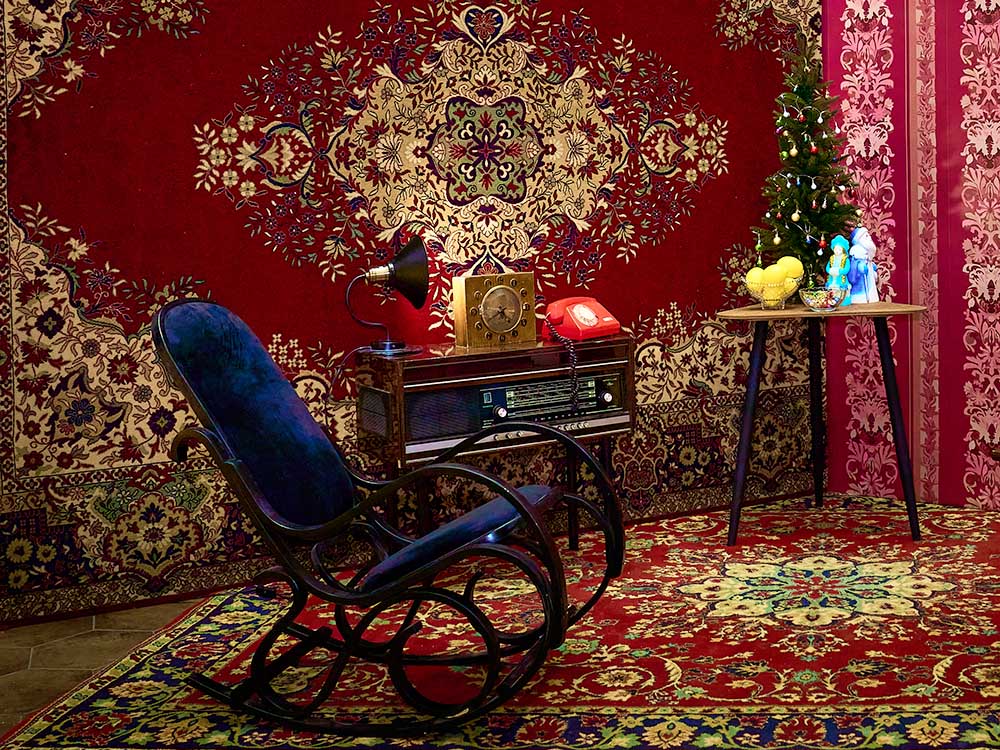 Стены фотозоны имеют характерный декор: одна стена украшена большим ковром с классическим орнаментом, другая — обоями с выразительным бордовым узором, создающими аутентичную атмосферу эпохи. Из мебели представлены кресло-качалка с мягкой обивкой, деревянное кресло с голубой обивкой и небольшой столик с новогодними украшениями.
