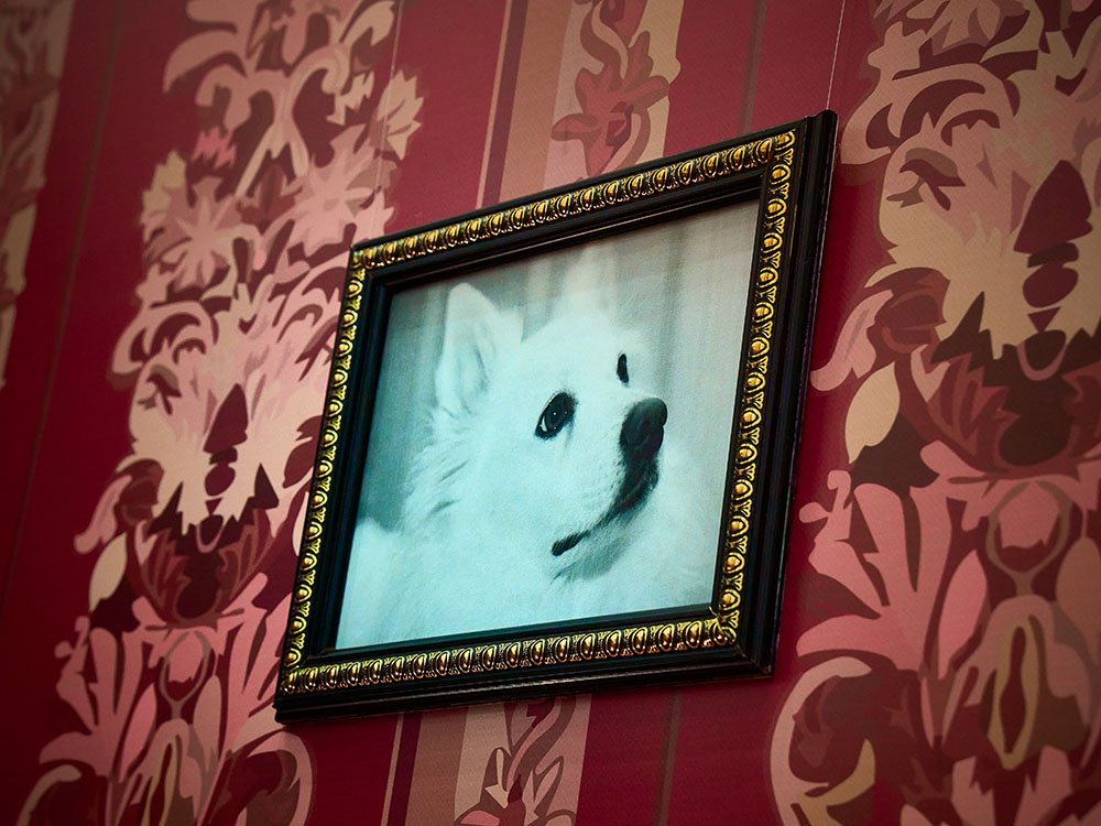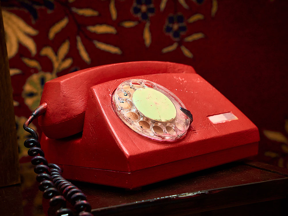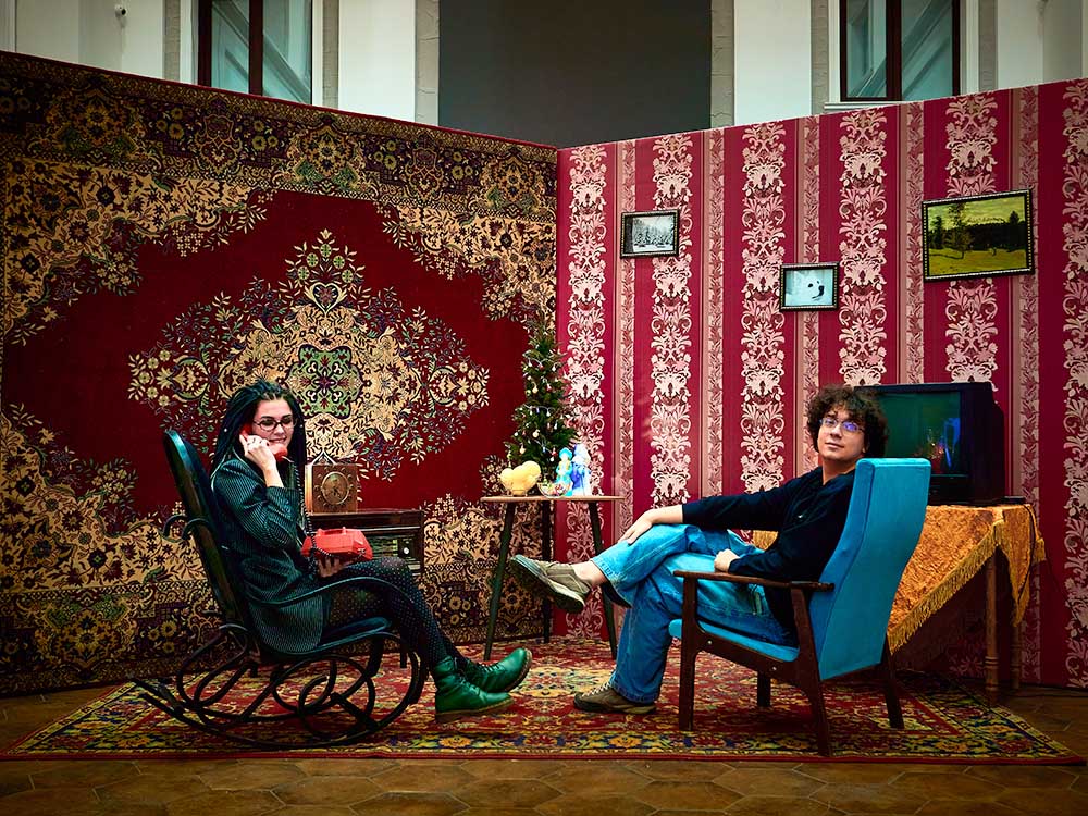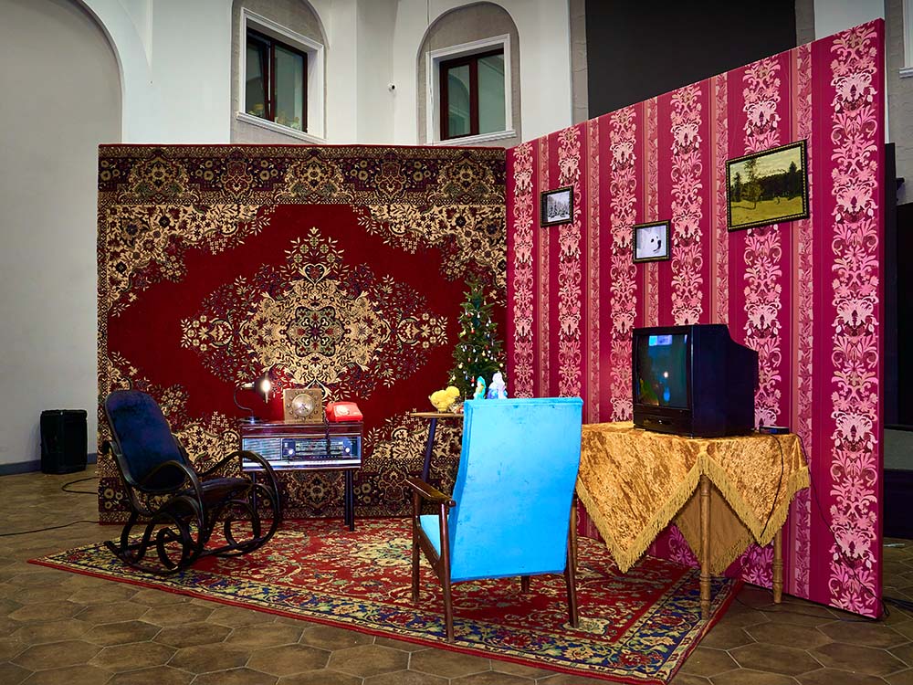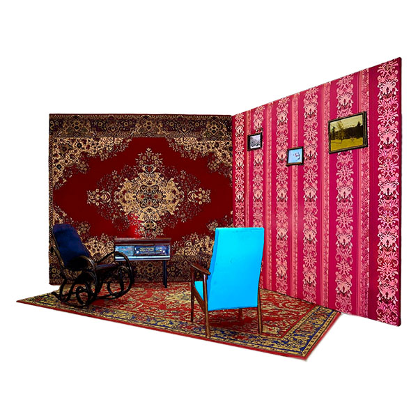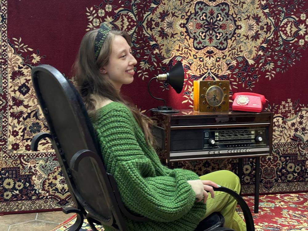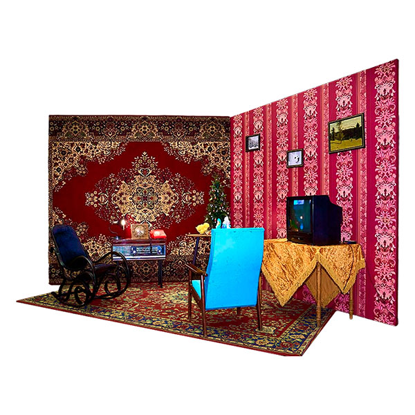 Помимо этого, фотозона наполнена такими ностальгическими предметами советского быта, как телевизор с характерным зеленым свечением экрана, ретро-радиоприемник, дисковый телефон красного цвета и настольные часы в деревянном корпусе. Завершают композицию ковер с восточным орнаментом на полу и фотографии в рамках на стене.