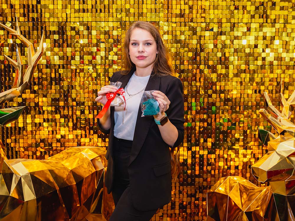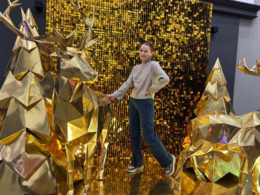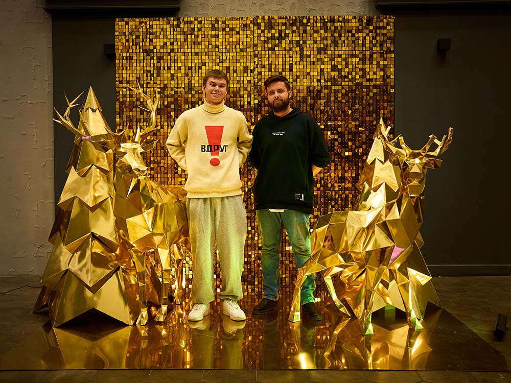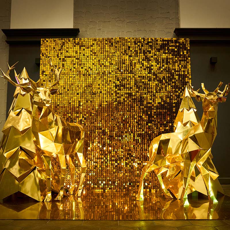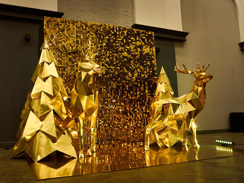 Подарите праздничное настроение своим коллегам, гостям и клиентам на новогоднем мероприятии с фотозоной, выполненной из золотых оленей с ёлкой. Такое украшение позволит сделать гостям яркие снимки рядом со стильными полигональными фигурами. Материал похожий на глянец будет переливаться в лучах вспышек делая каждый снимок неповторимым. Для какого формата подойдёт:- Офисные торжества;