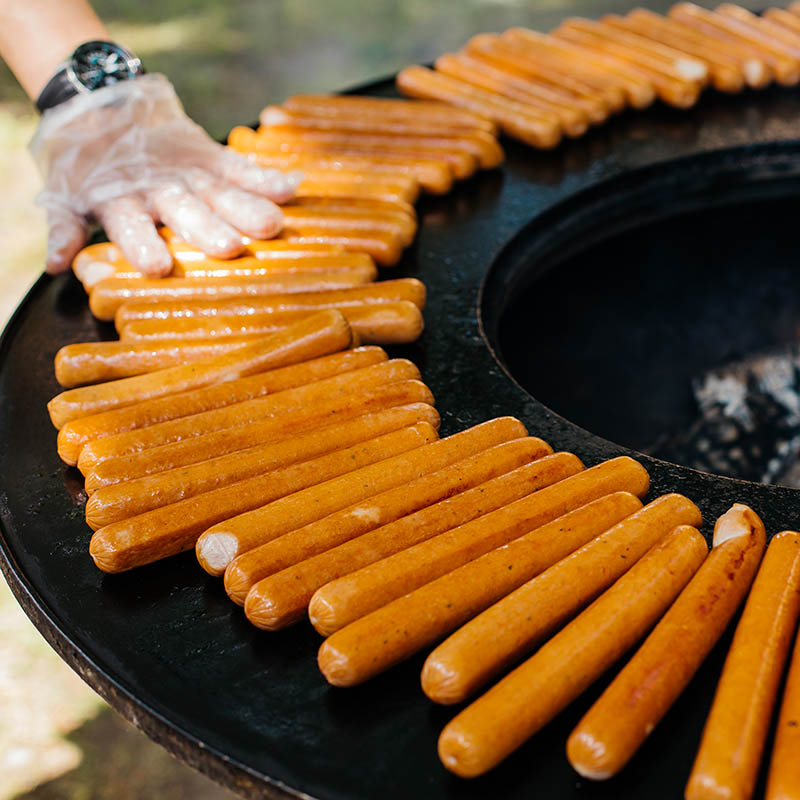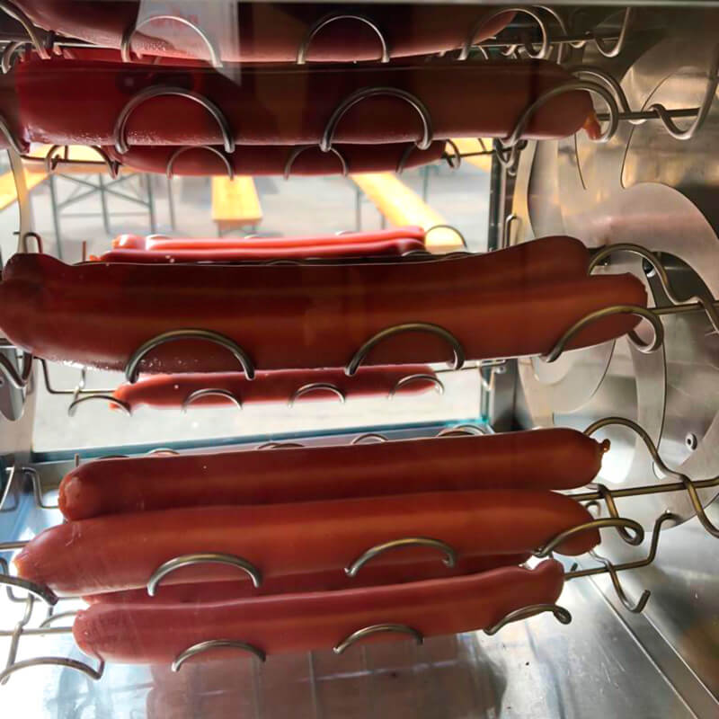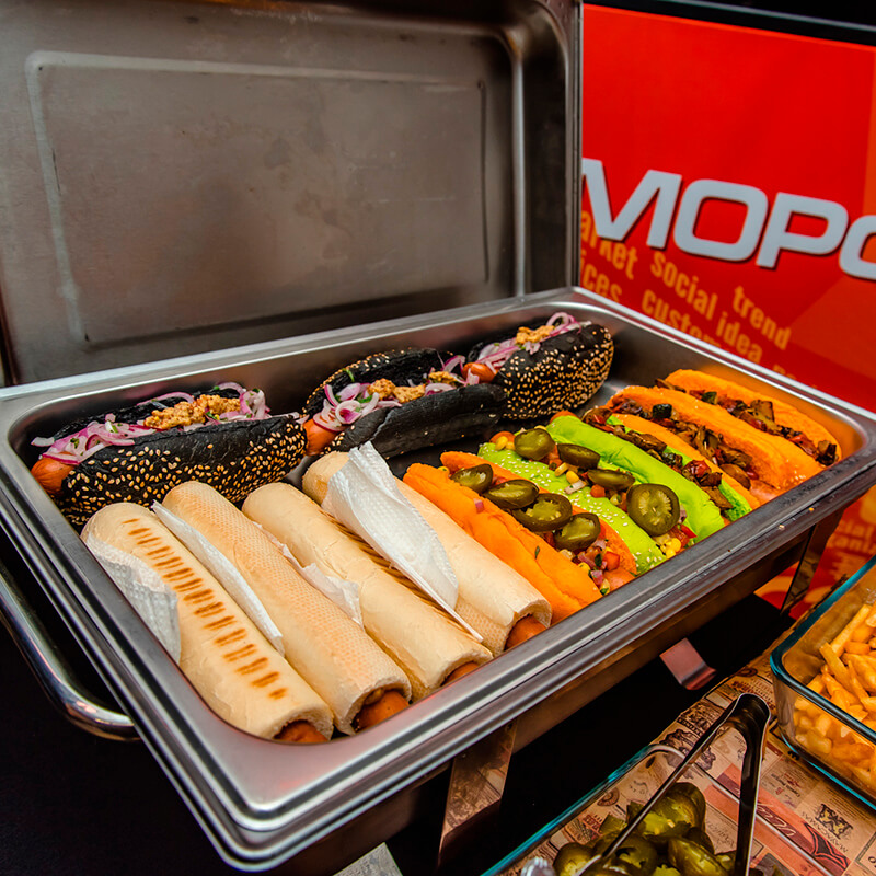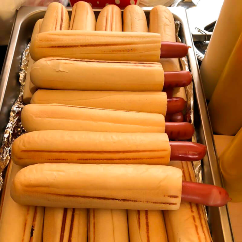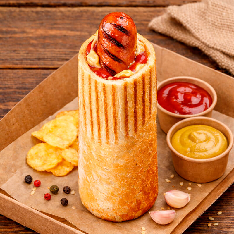 Главная изюминка французского хот дога - особая подача: вместо разрезанной вдоль булочки используется булочка с готовым отверстием, в который аккуратно вставляется сосиска. Свиная сосиска, горчичный соус, сырный соус и кетчуп, булочка.